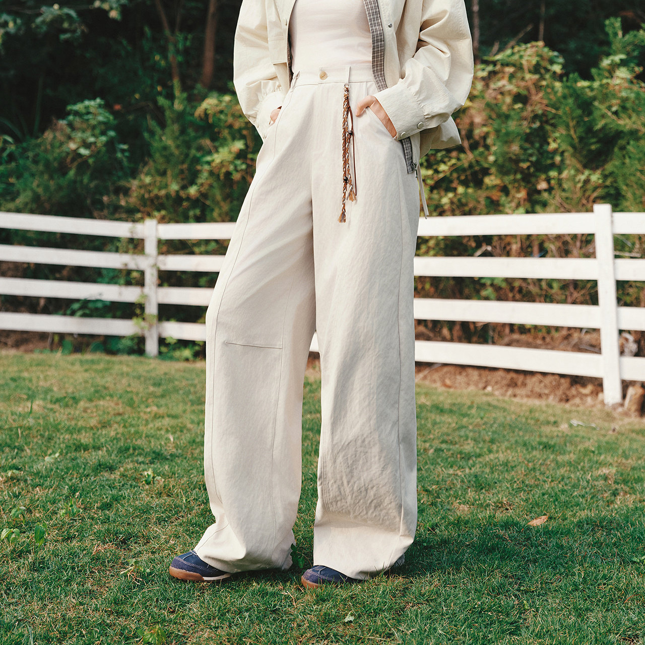 森马休闲裤女肌理长裤宽松2026新款弯刀裤微弹灰白色裤子韩里韩气