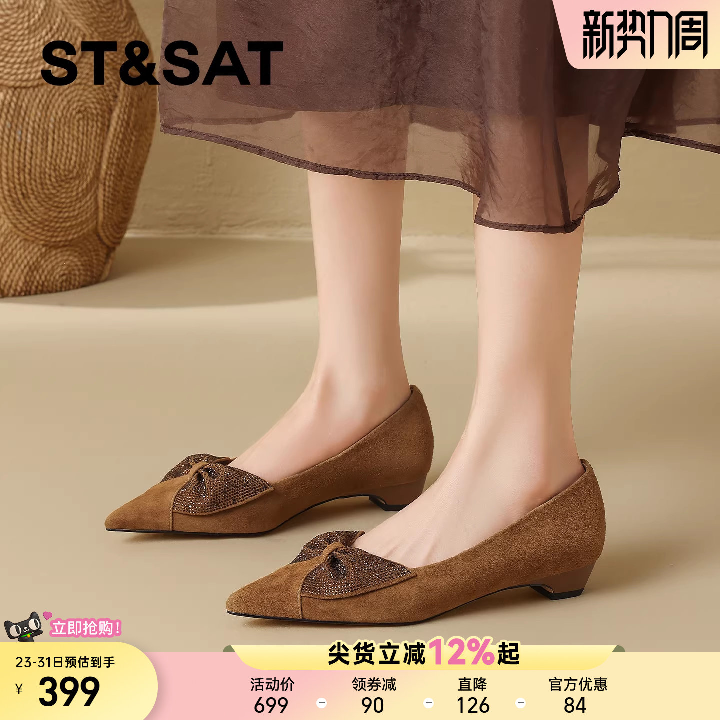 星期六真皮法式浅口单鞋女2026春季新款尖头坡跟贴钻蝴蝶结时装鞋