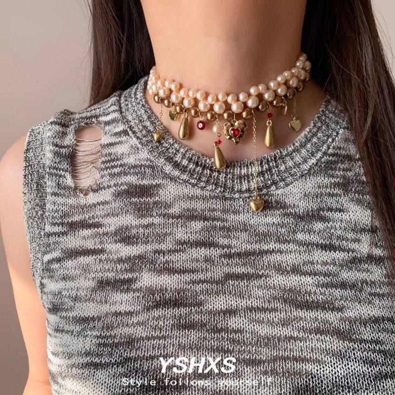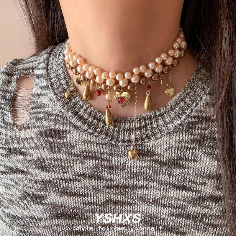 金色复古多层流苏珍珠项链女金属重工爱心水滴吊坠波西米亚颈链