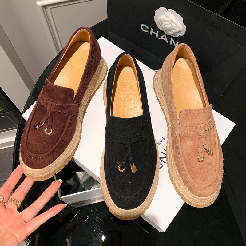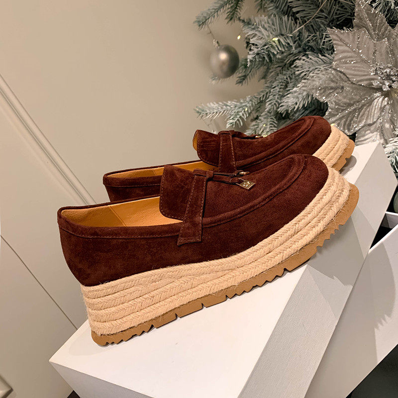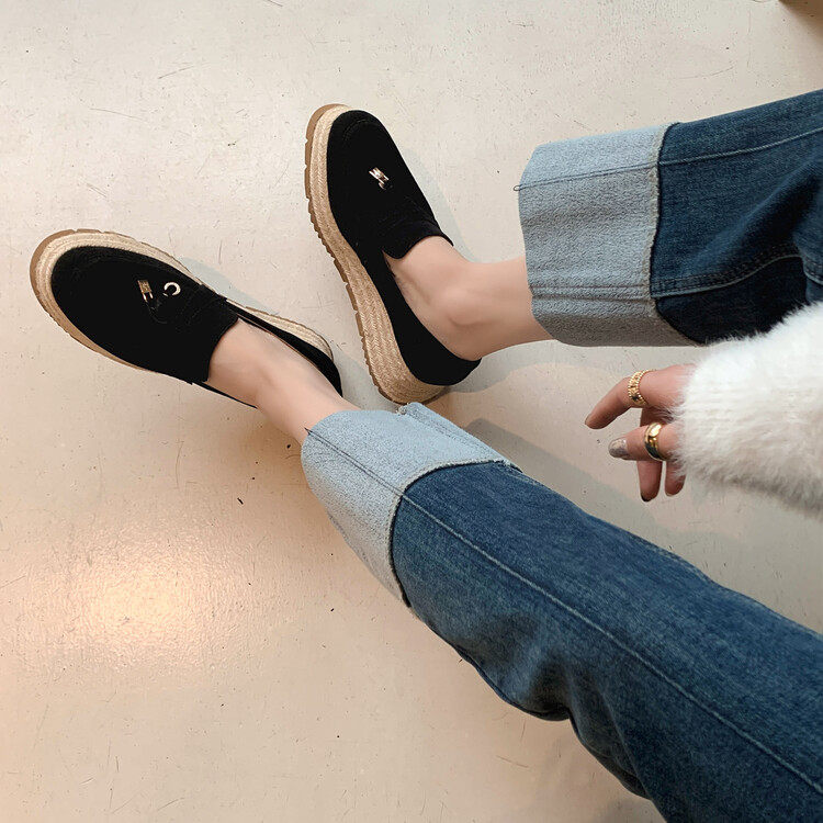 2025春新款磨砂真皮厚底圆头乐福鞋女草编坡跟松糕底复古懒人单鞋