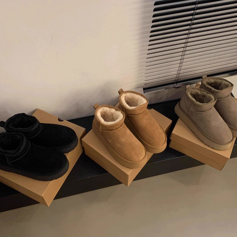 miu家厚底雪地靴女冬季真皮短靴羊毛侧拉链增高厚底加绒毛毛棉鞋