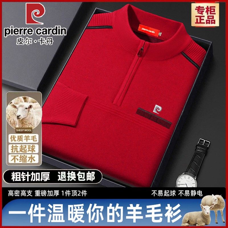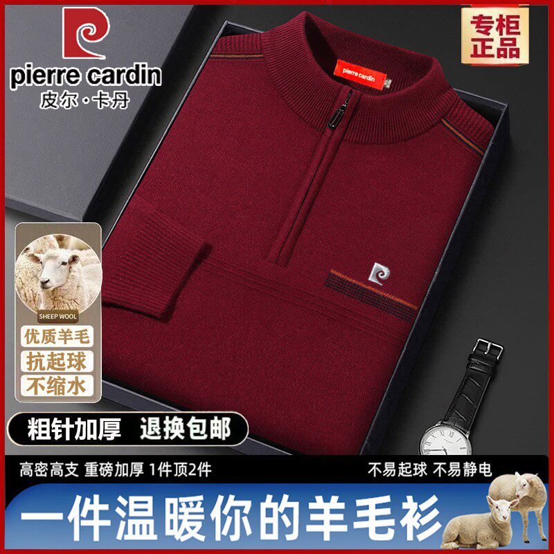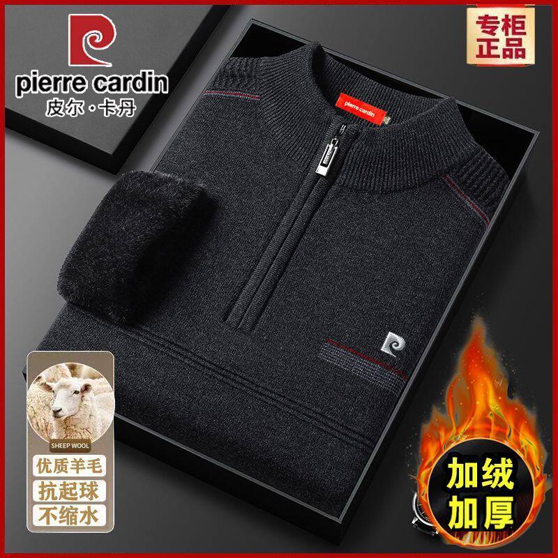 皮尔卡丹高档羊毛衫男士冬季加绒加厚毛衣半高领拉链中年保暖上衣