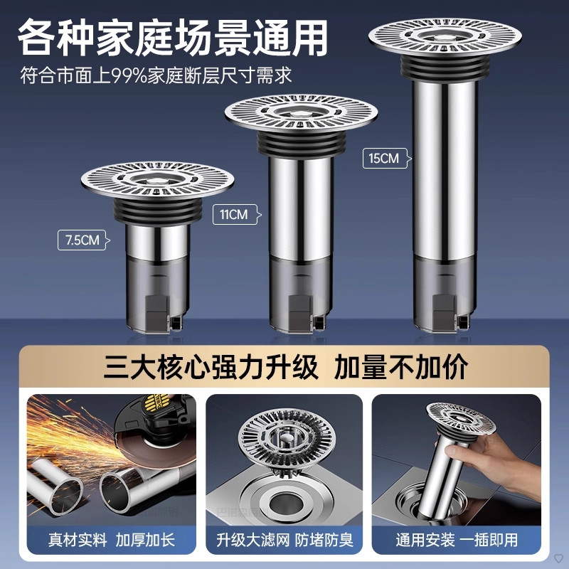 断层加长地漏芯卫生间下水不锈钢防虫大口径延长管防臭专用内芯