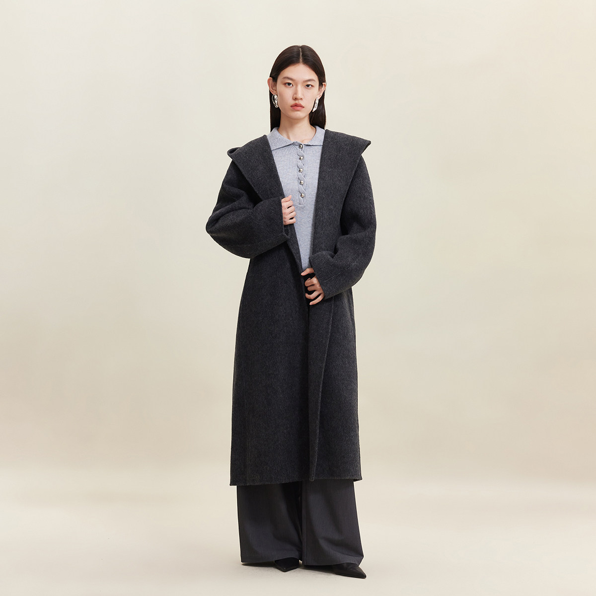 RUISHI芮时重磅驼绒桑蚕丝羊毛慵懒两穿领灰色毛呢大衣秋冬外套女
