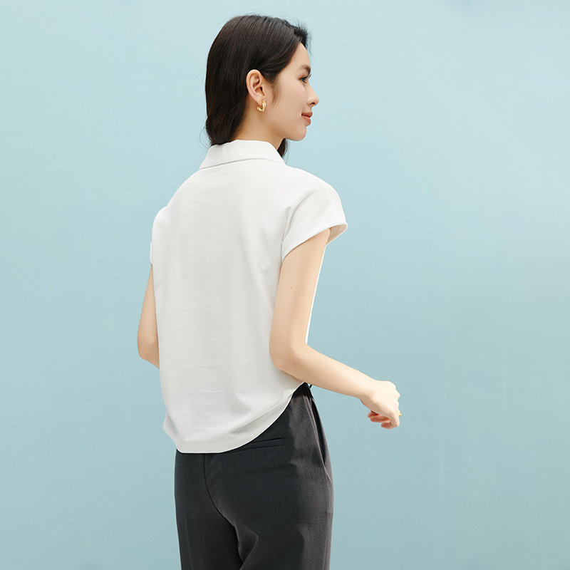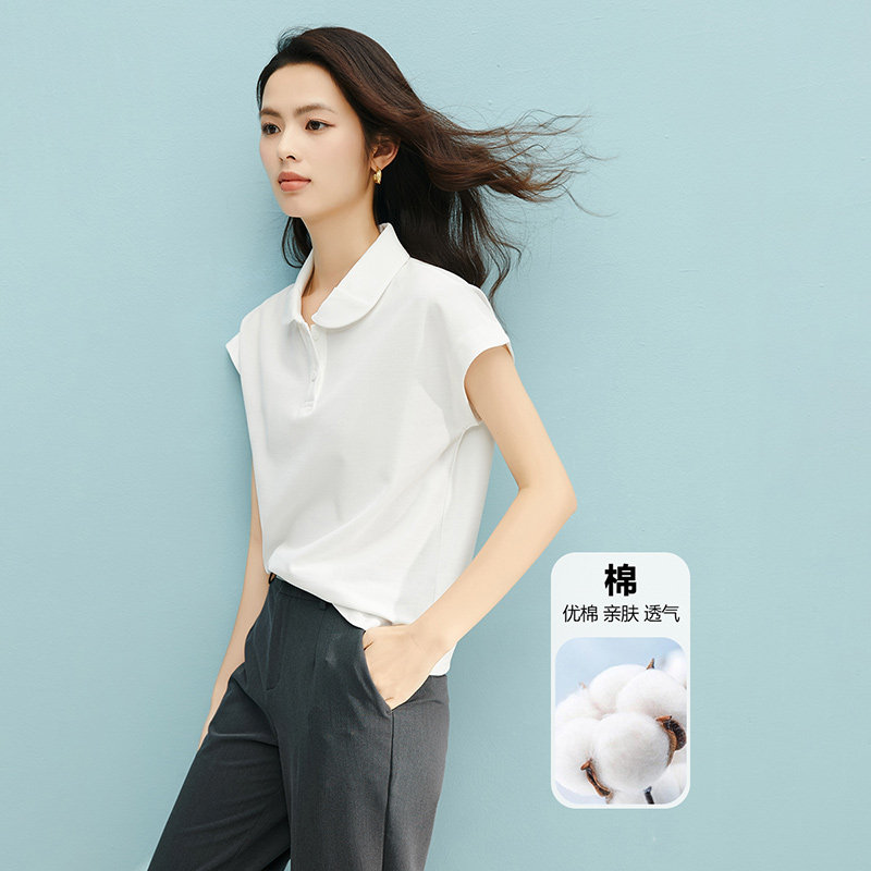 晚白2026年春新款经典简约翻领棉料上衣亲肤休闲短袖T恤衫女