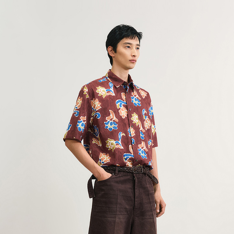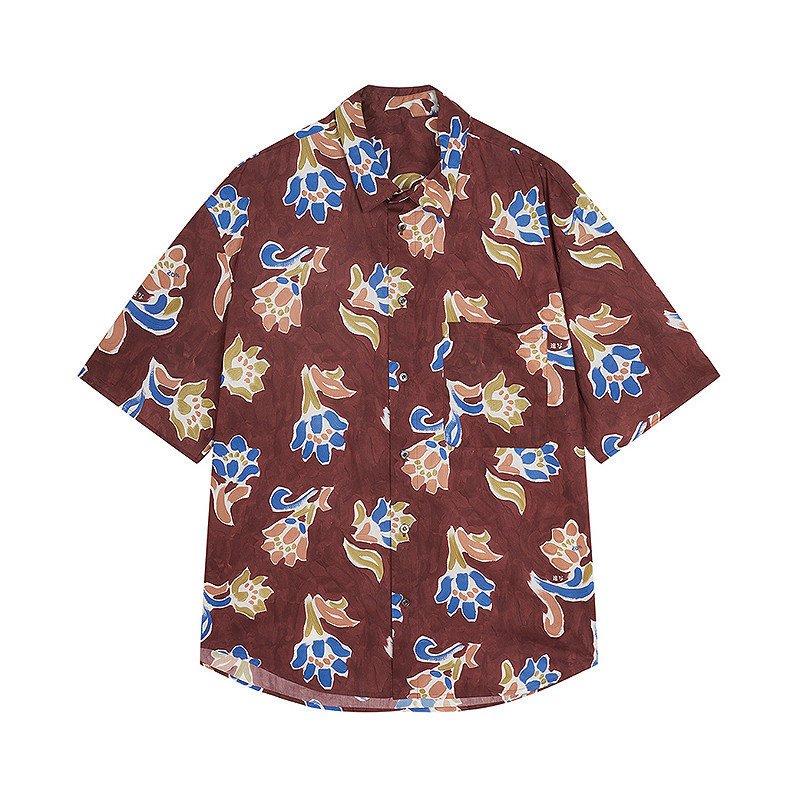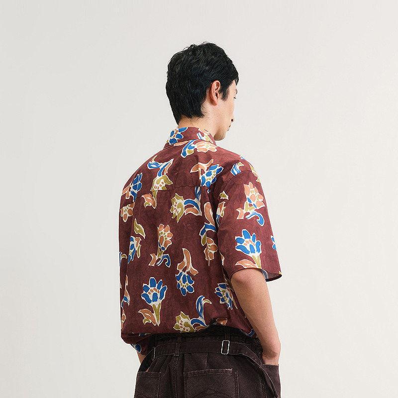 速写男装春夏新款男士衬衫植物花卉短袖衬衫宽松棉质度假感休闲