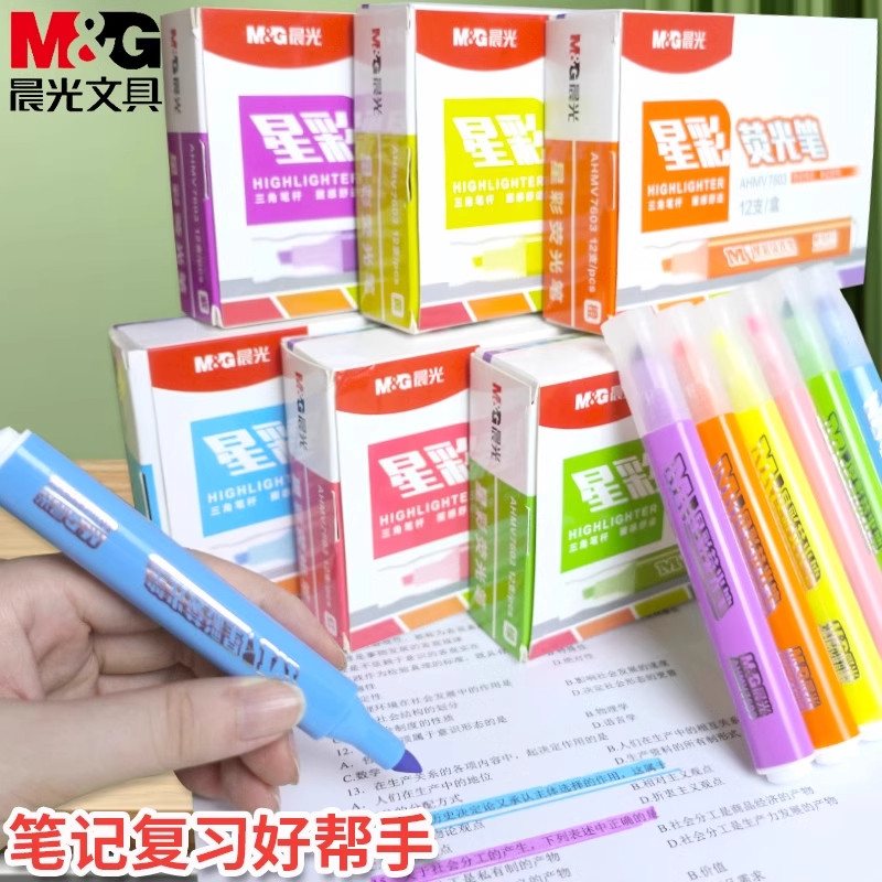 晨光文具儿童星彩荧光笔标记学生用记号笔3色6色大容量手账笔标书考研划重点背书神器水彩笔闪粉夜光彩色笔