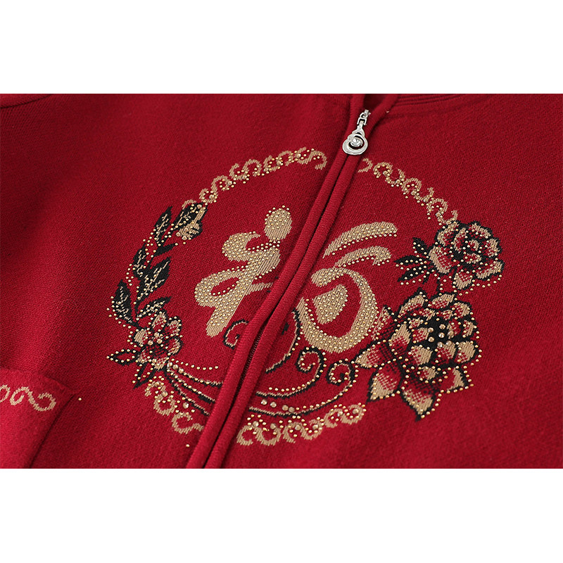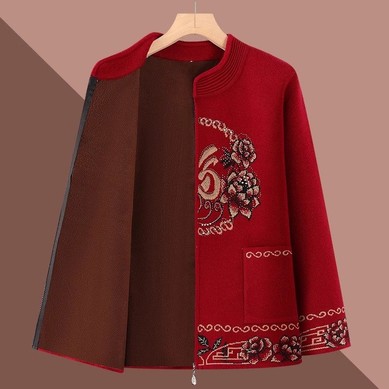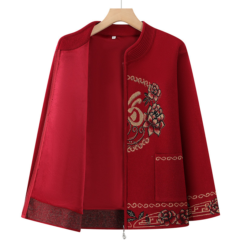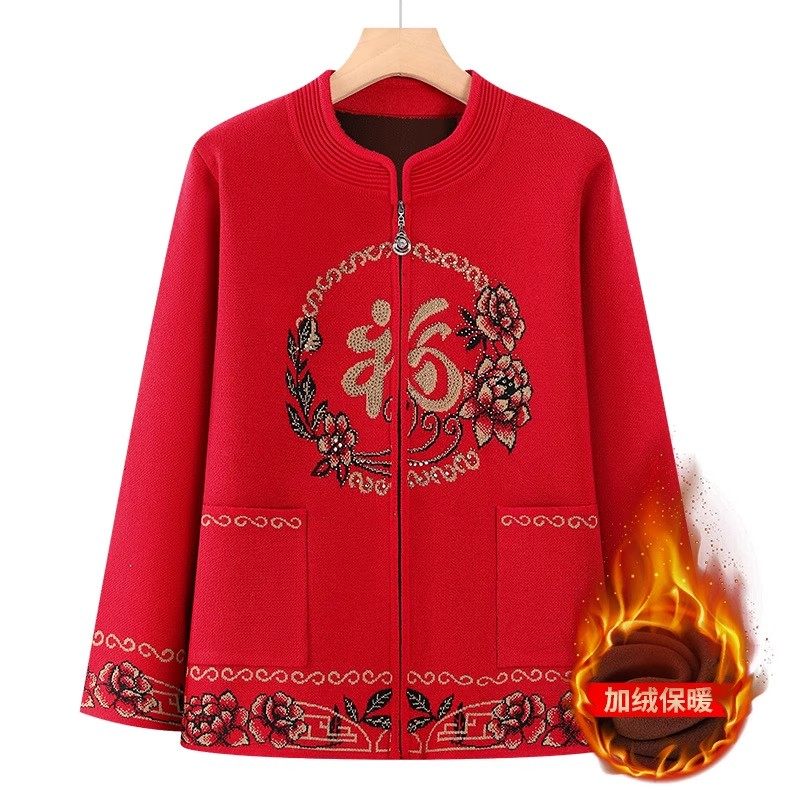 高档中老年女奶奶冬装外套唐装加绒保暖毛衣妈妈开衫衣服红色冬季