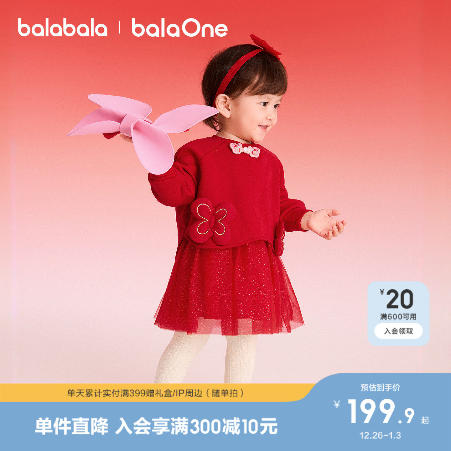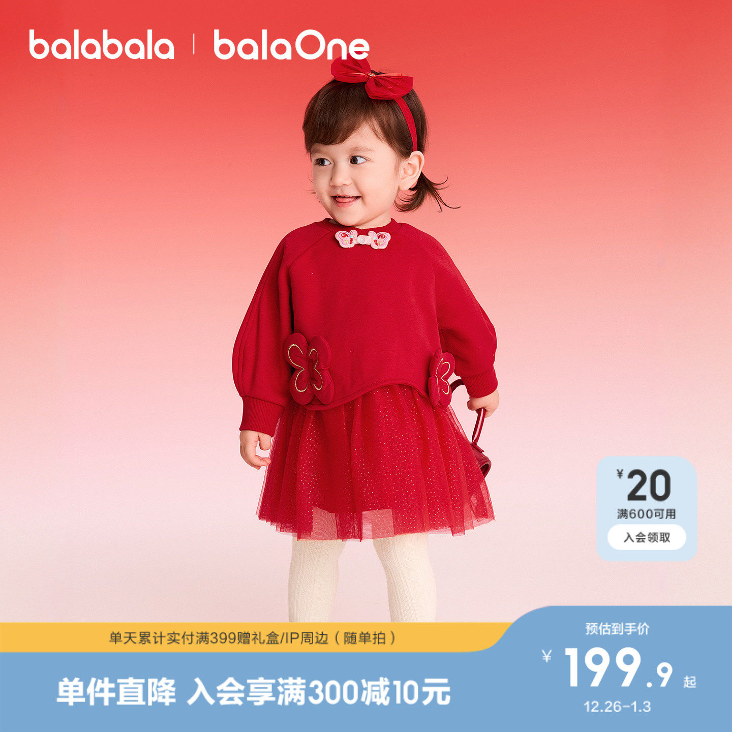 巴拉巴拉童装女童连衣裙子新中式2025新秋冬装红色拜年服宝宝网纱