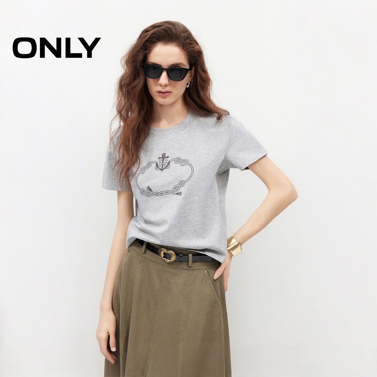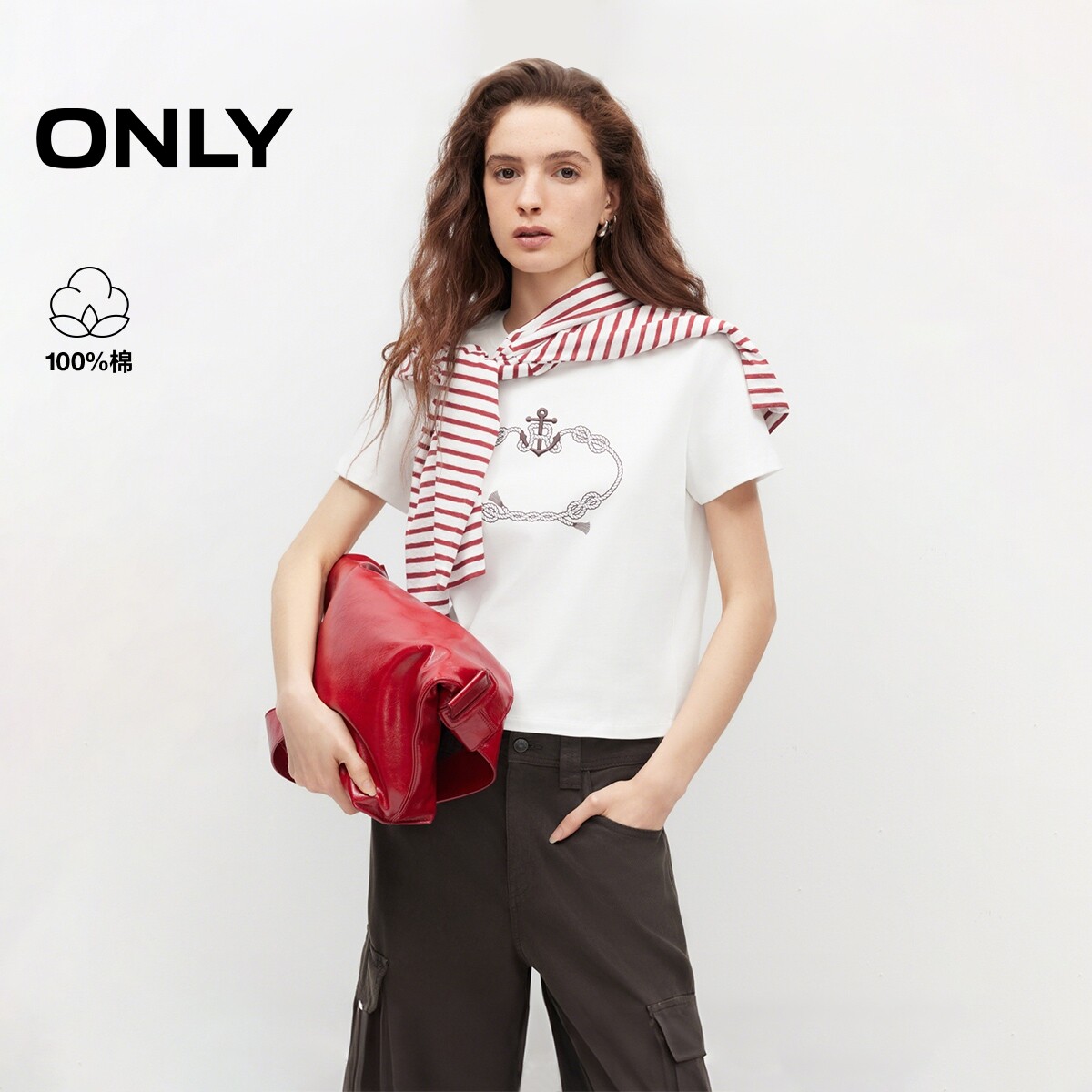 ONLY2026春季新款纯棉透气艺术感航海风印花休闲短款正肩T恤女