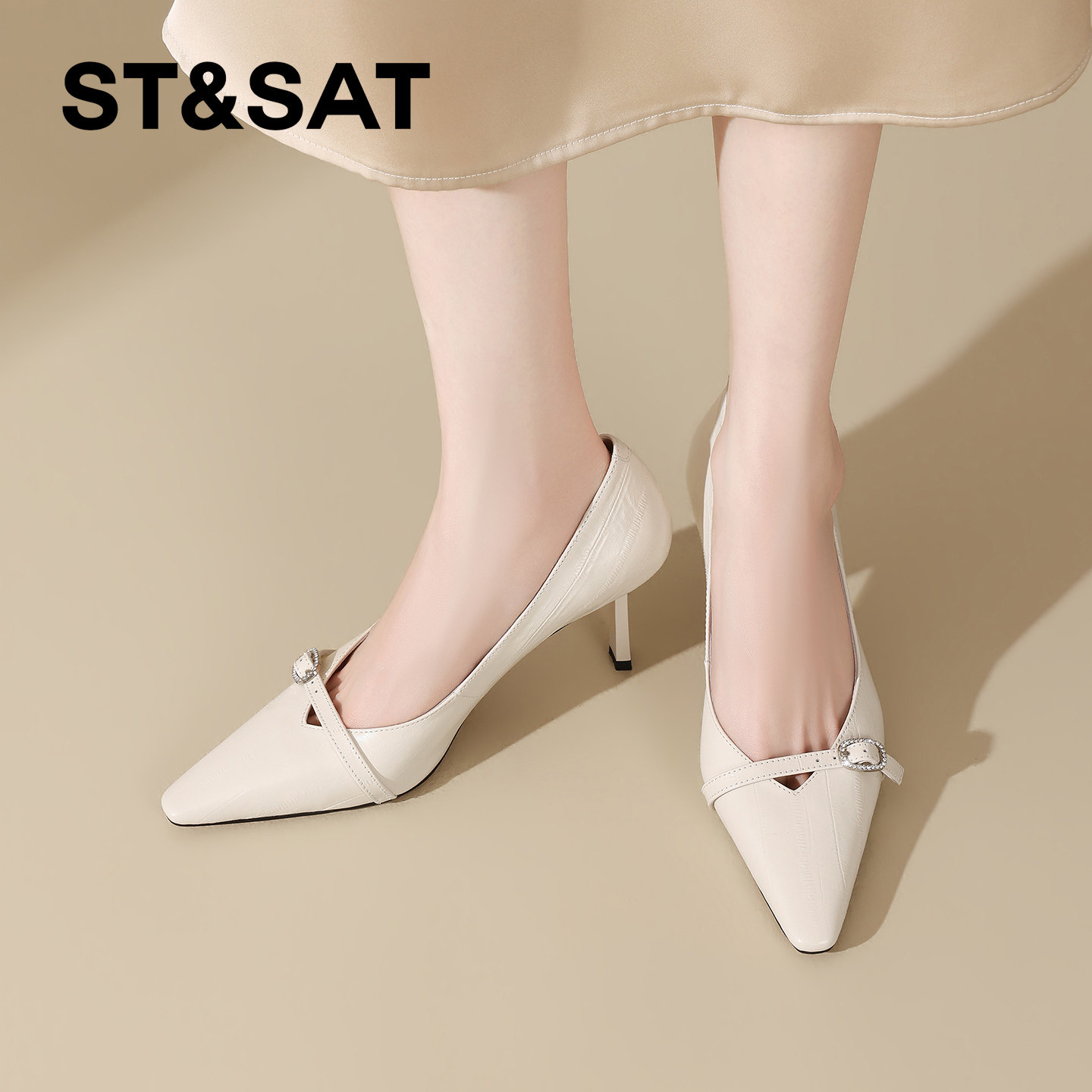 星期六复古风尖头性感女人浅口单鞋2026年春季新款细跟真皮高跟鞋