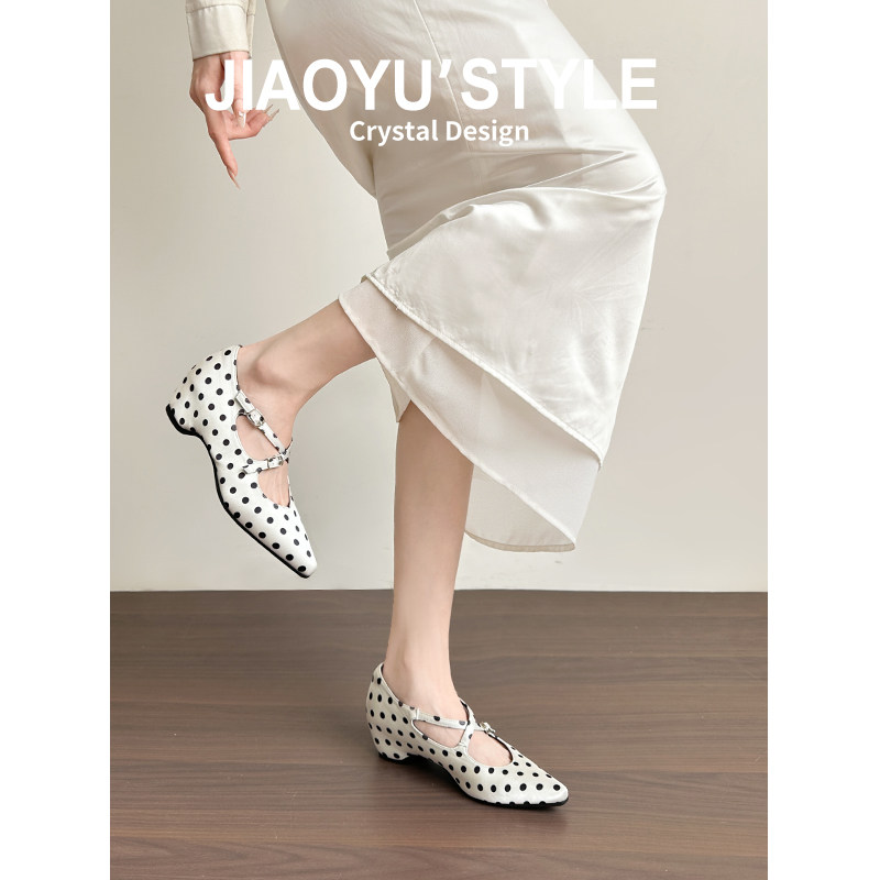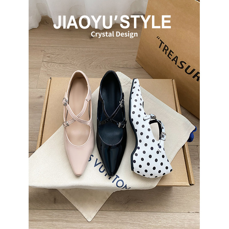 真皮~骄屿法式交叉带裸色玛丽珍鞋女尖头气质高跟鞋浅口芭蕾单鞋
