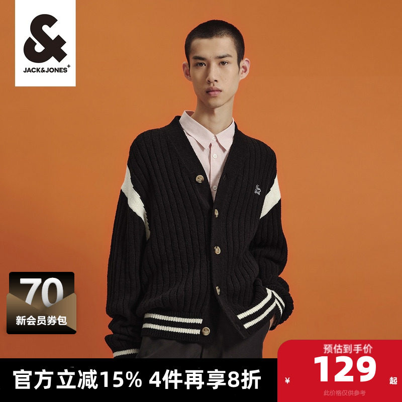 杰克琼斯24秋季针织衫男通勤字母刺绣V领毛衣纯棉开衫外套男装