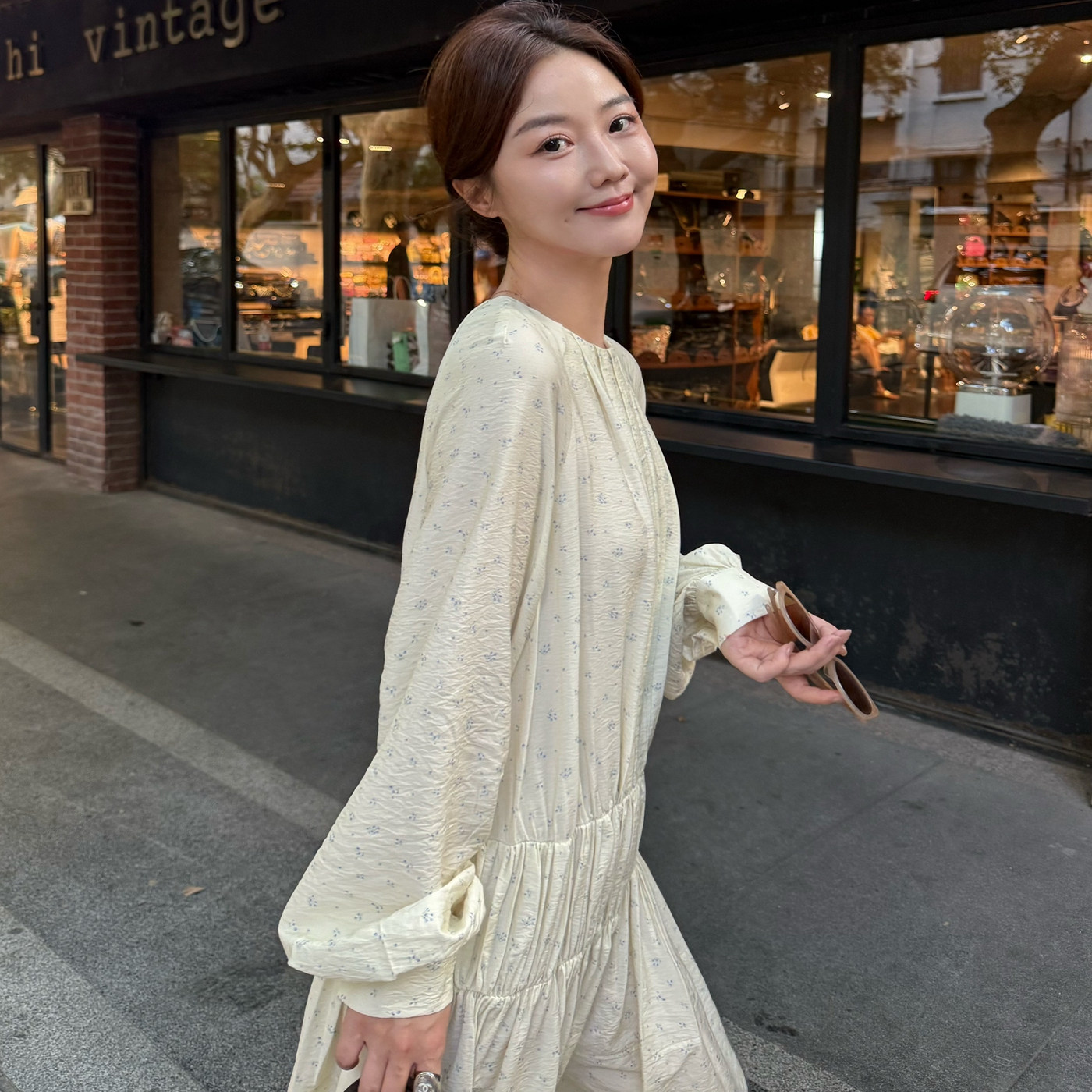 曹大曼 法式复古低腰小碎花圆领长袖连衣裙长款宽松连衣裙2025秋