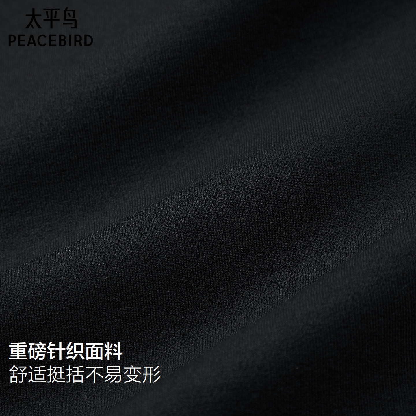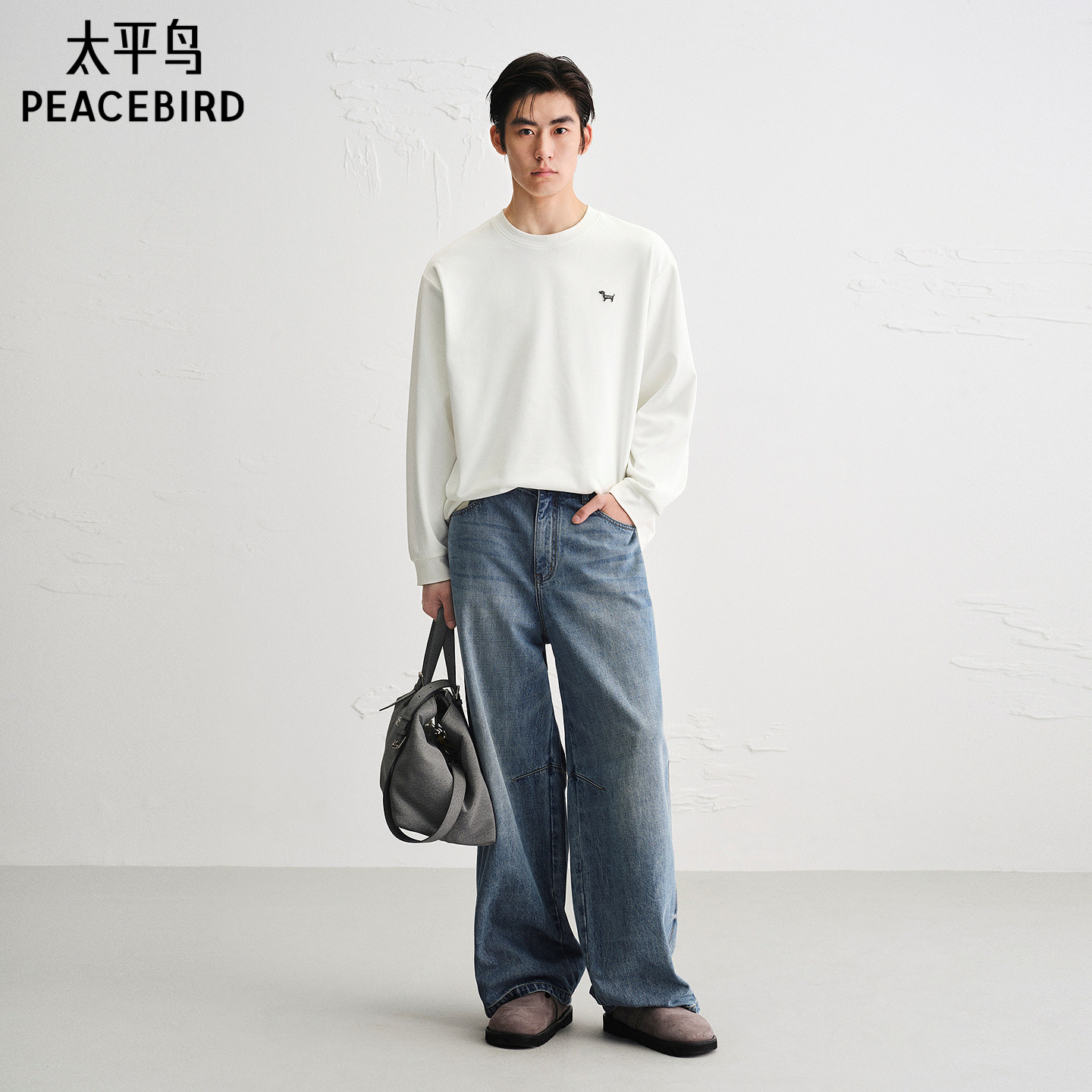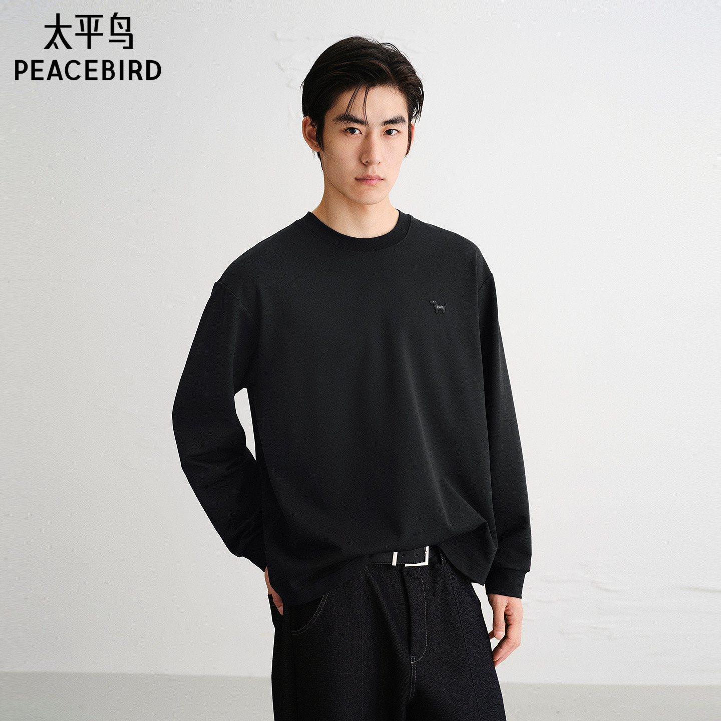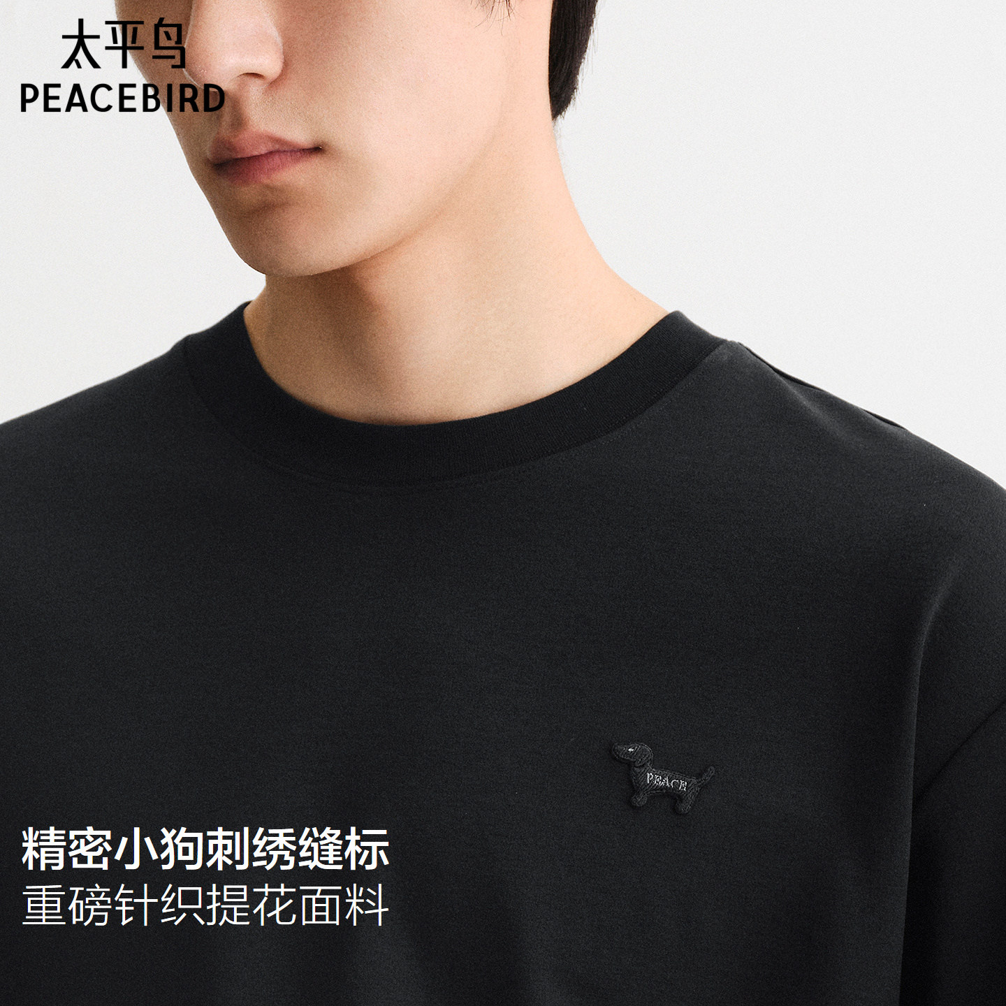 太平鸟男装T恤春秋季纯色重磅小狗刺绣长袖t宽松肌理打底衫潮流