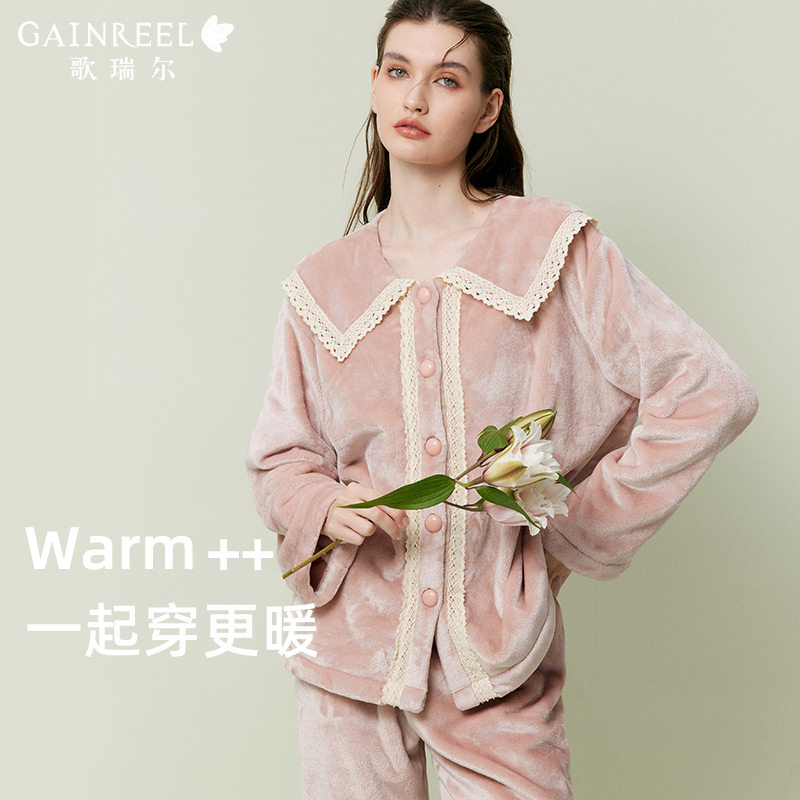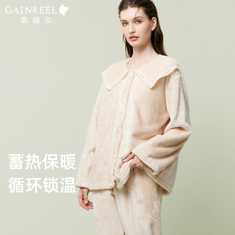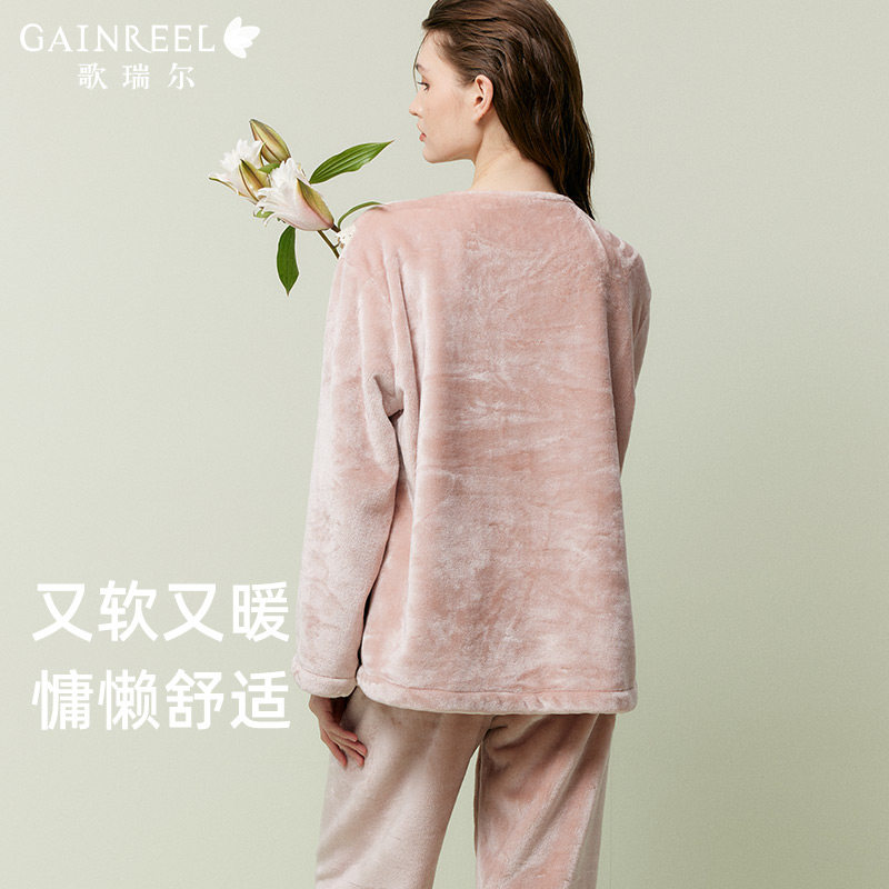 歌瑞尔保暖加绒加厚法兰绒睡衣女柔软秋冬新品珊瑚绒娃娃领家居服