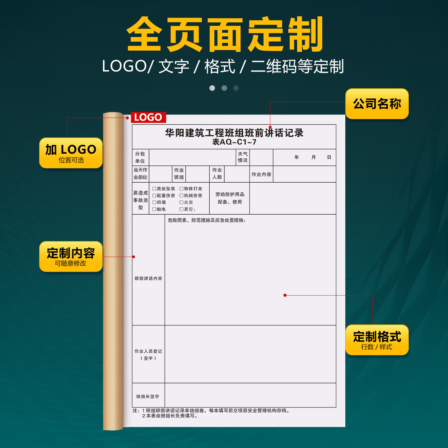 【班组班前安全活动记录本】定制建设工地施工安全日志工程现场旁站监理日记装修进度跟进表项目生产管理日志