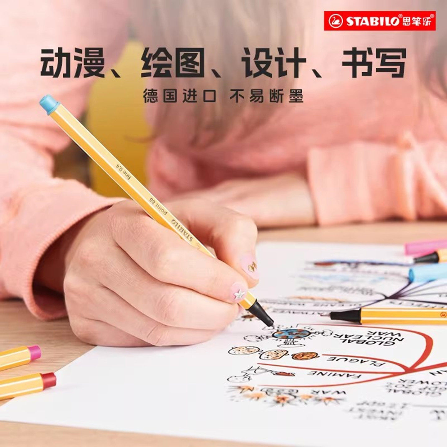stabilo 思笔乐德国进口记号笔勾线笔针管美术漫画描边专用动漫绘画笔中性笔0.4绘图笔防泼水黑色彩色柔绘笔