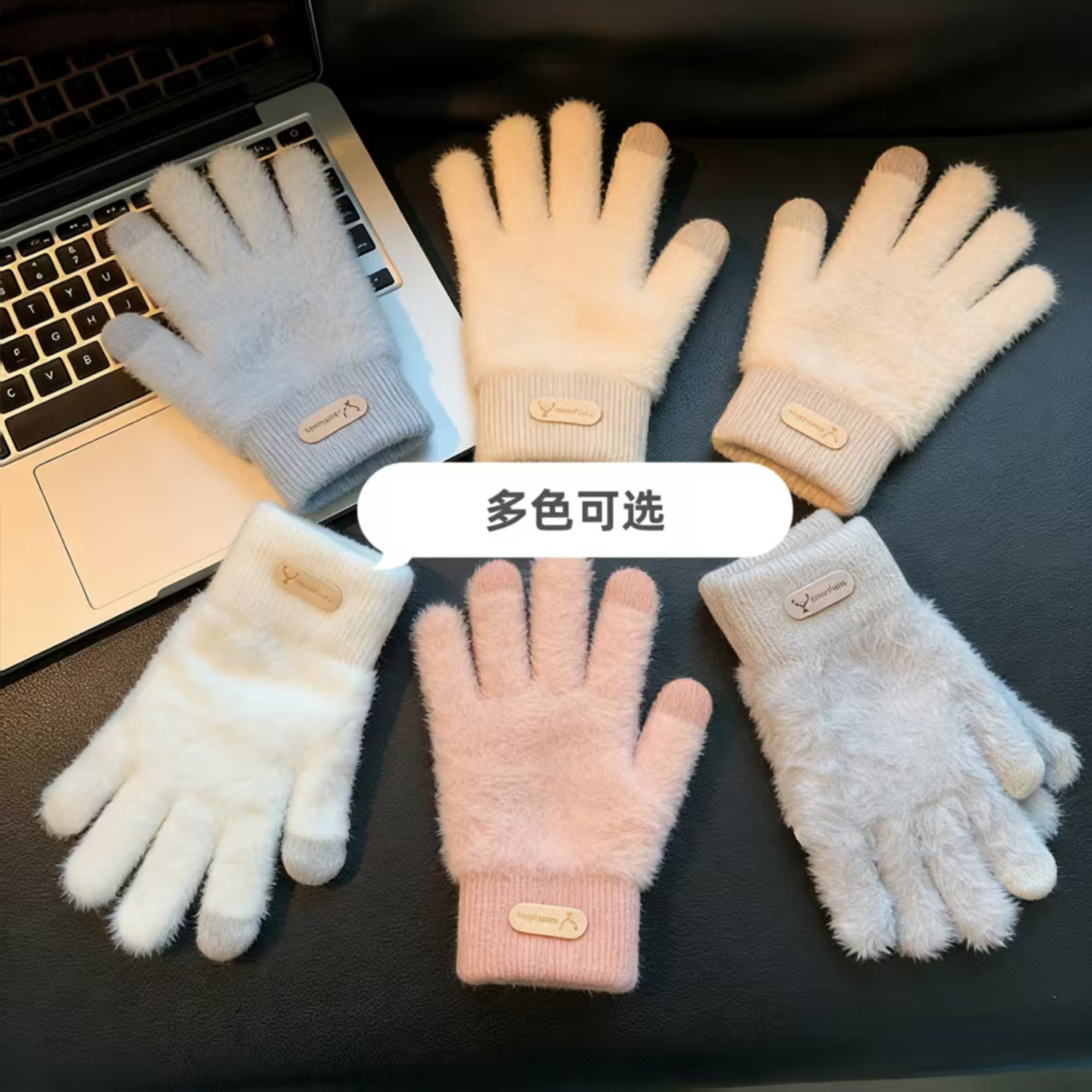 白色毛绒手套女生冬双层加厚保暖可触屏骑车防寒纯色五指针织手套