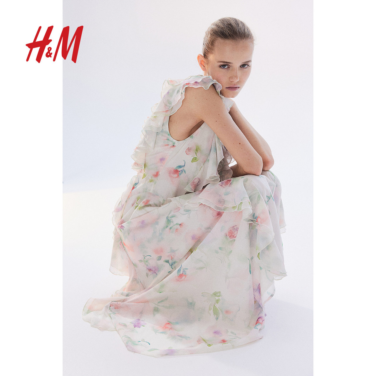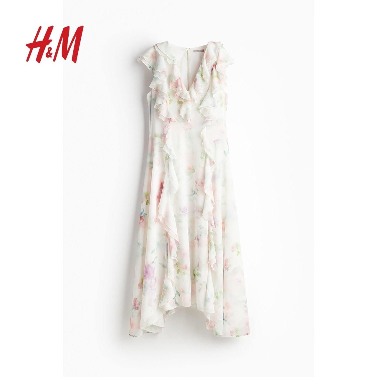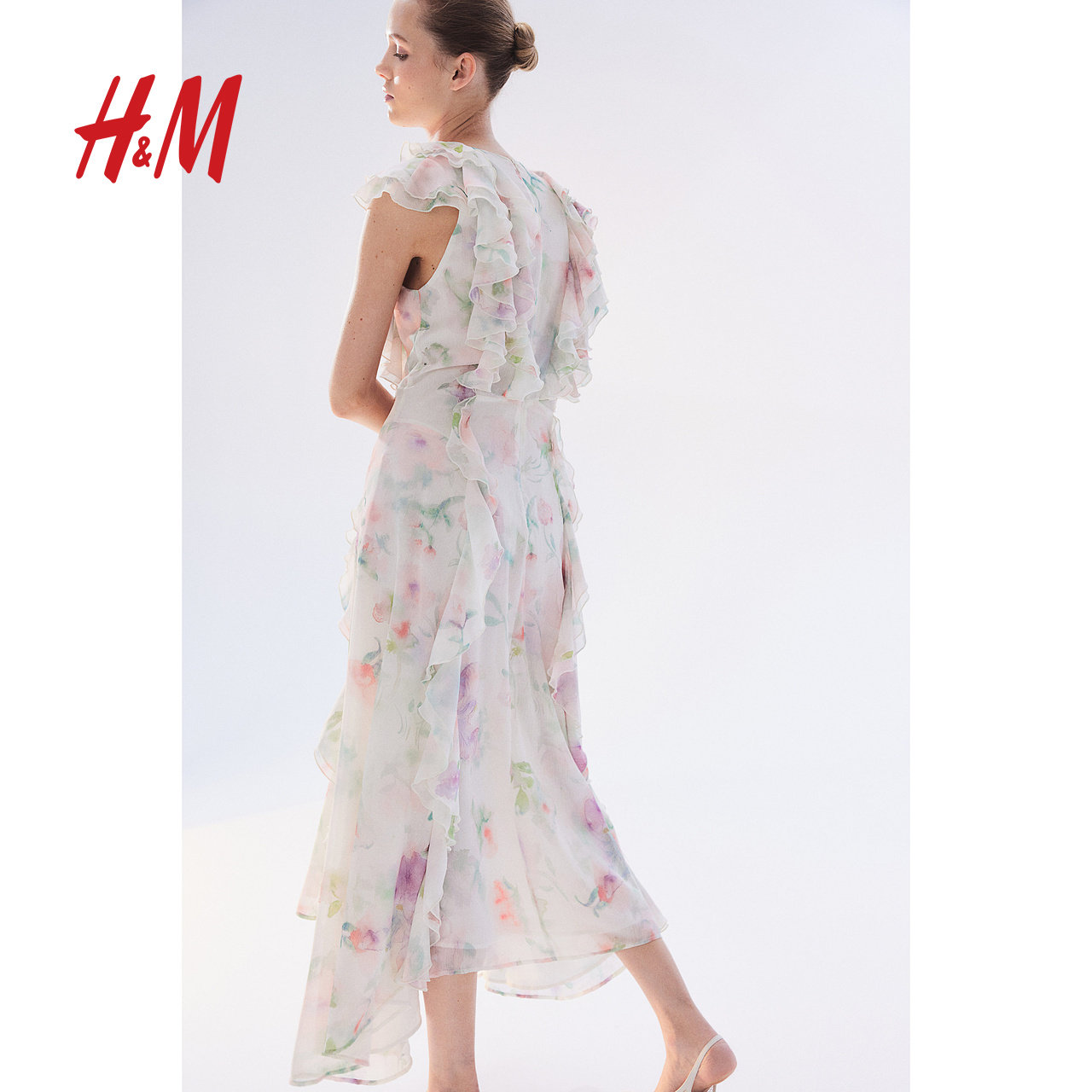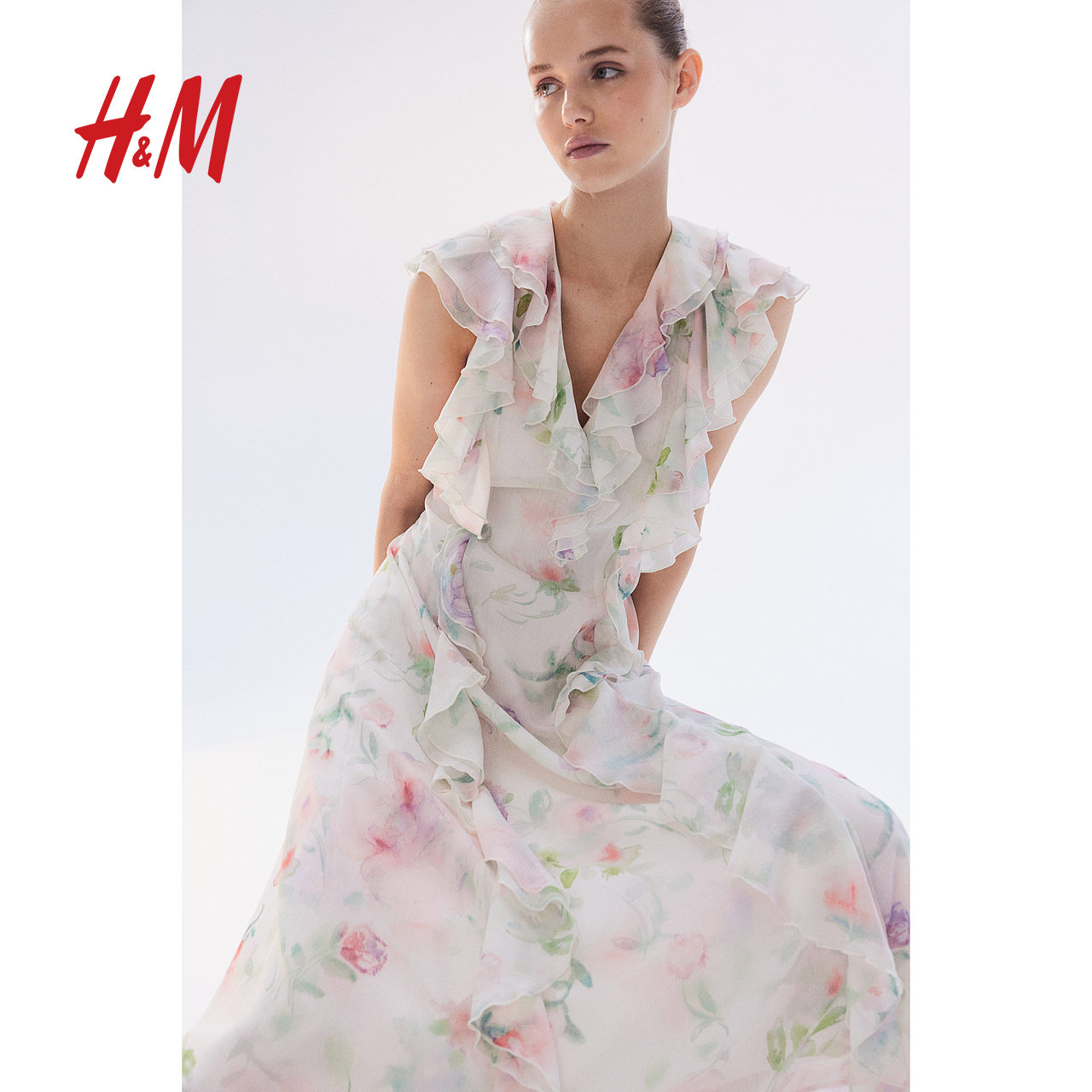 HM女装连衣裙冬季女士休闲简约荷叶边雪纺连衣裙1236797