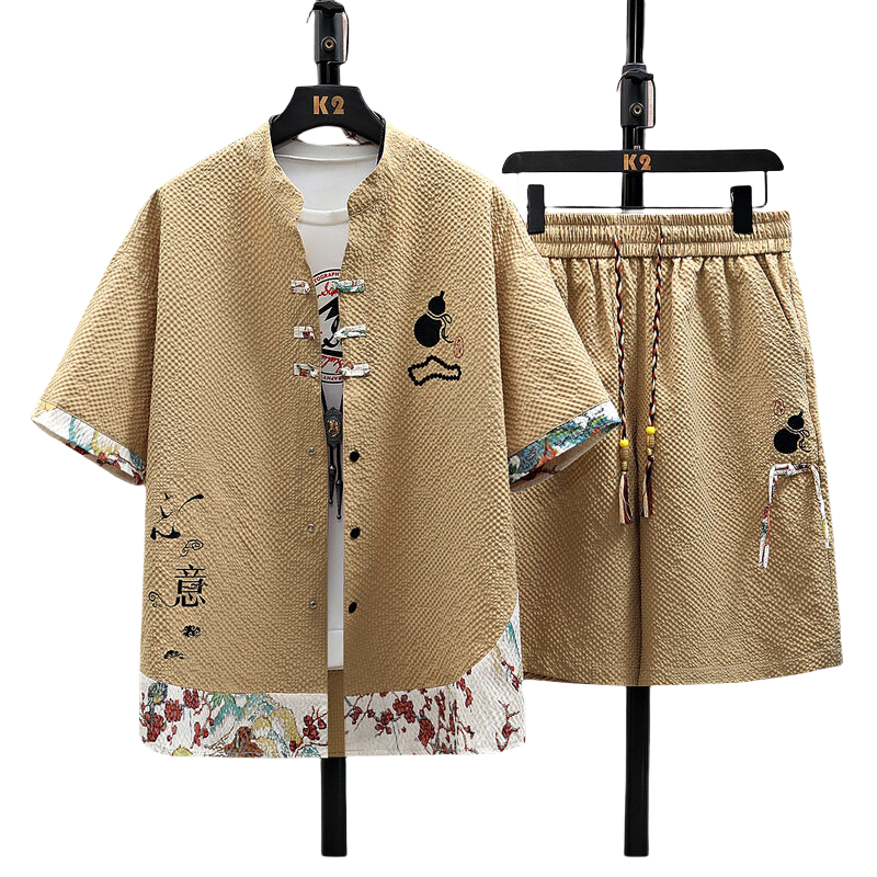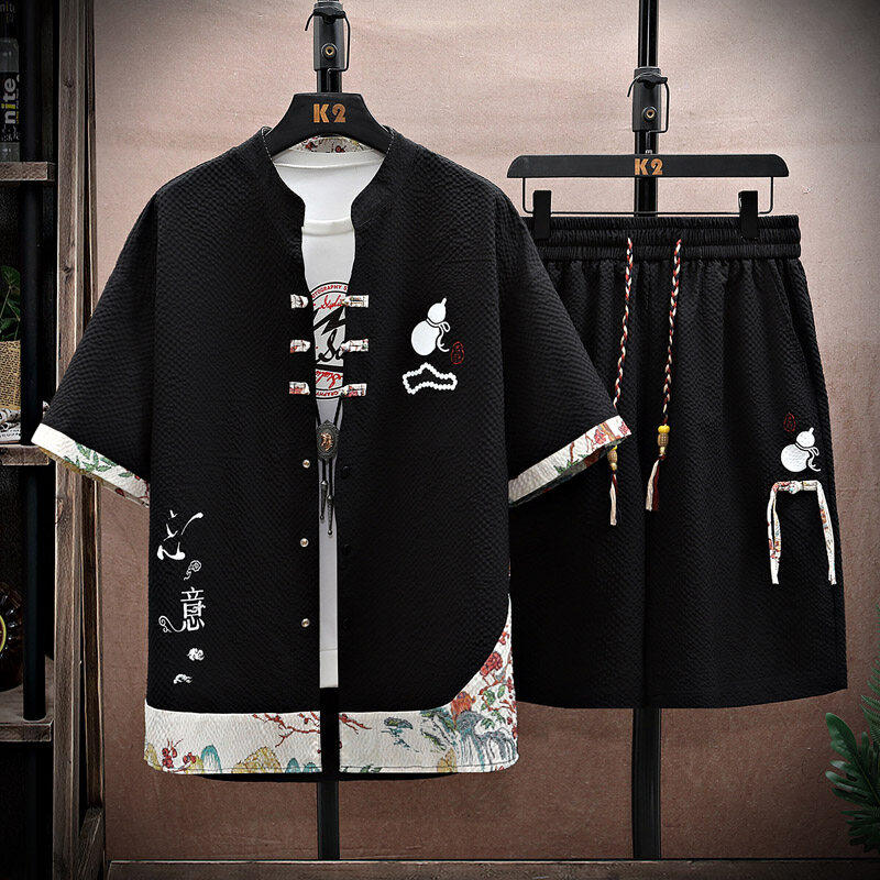 中国风套装男短袖夏季潮牌棉感上衣服渐变色外套新中式盘口唐装男