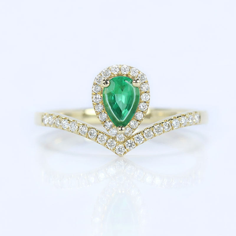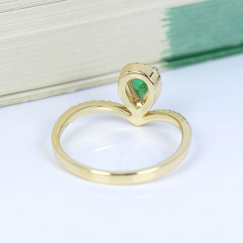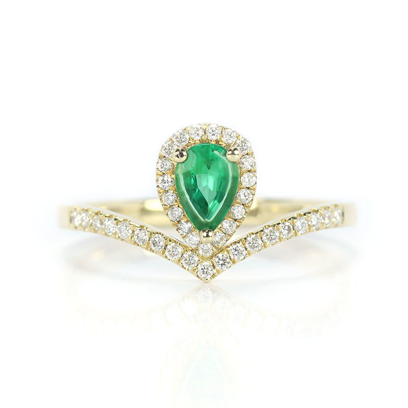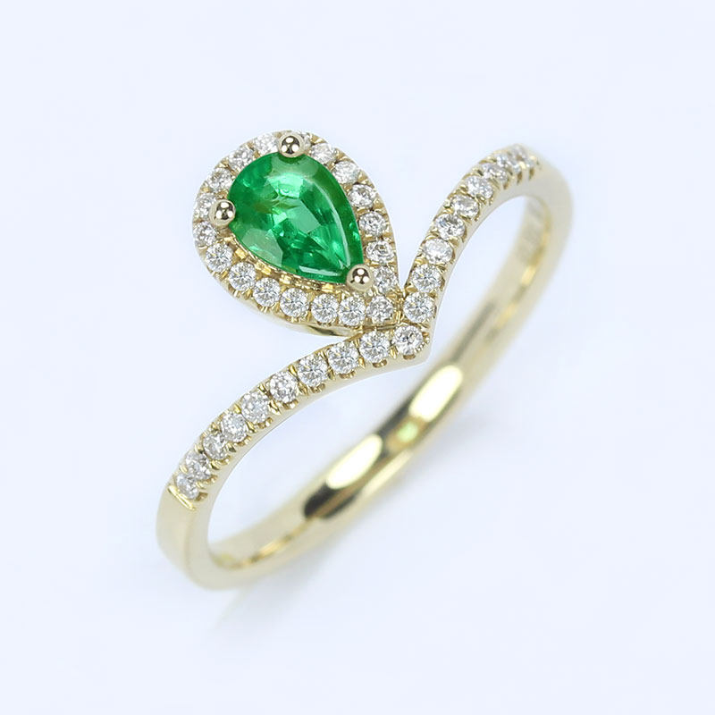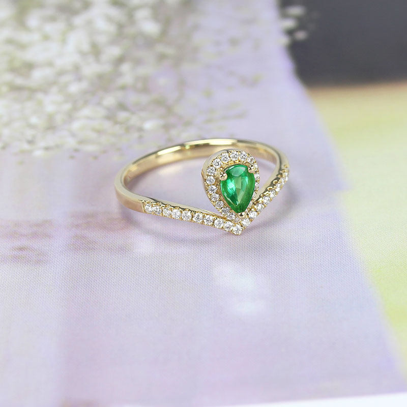G18K黄金天然祖母绿钻石水滴形V字戒指 亮绿色宝石手饰正品女款