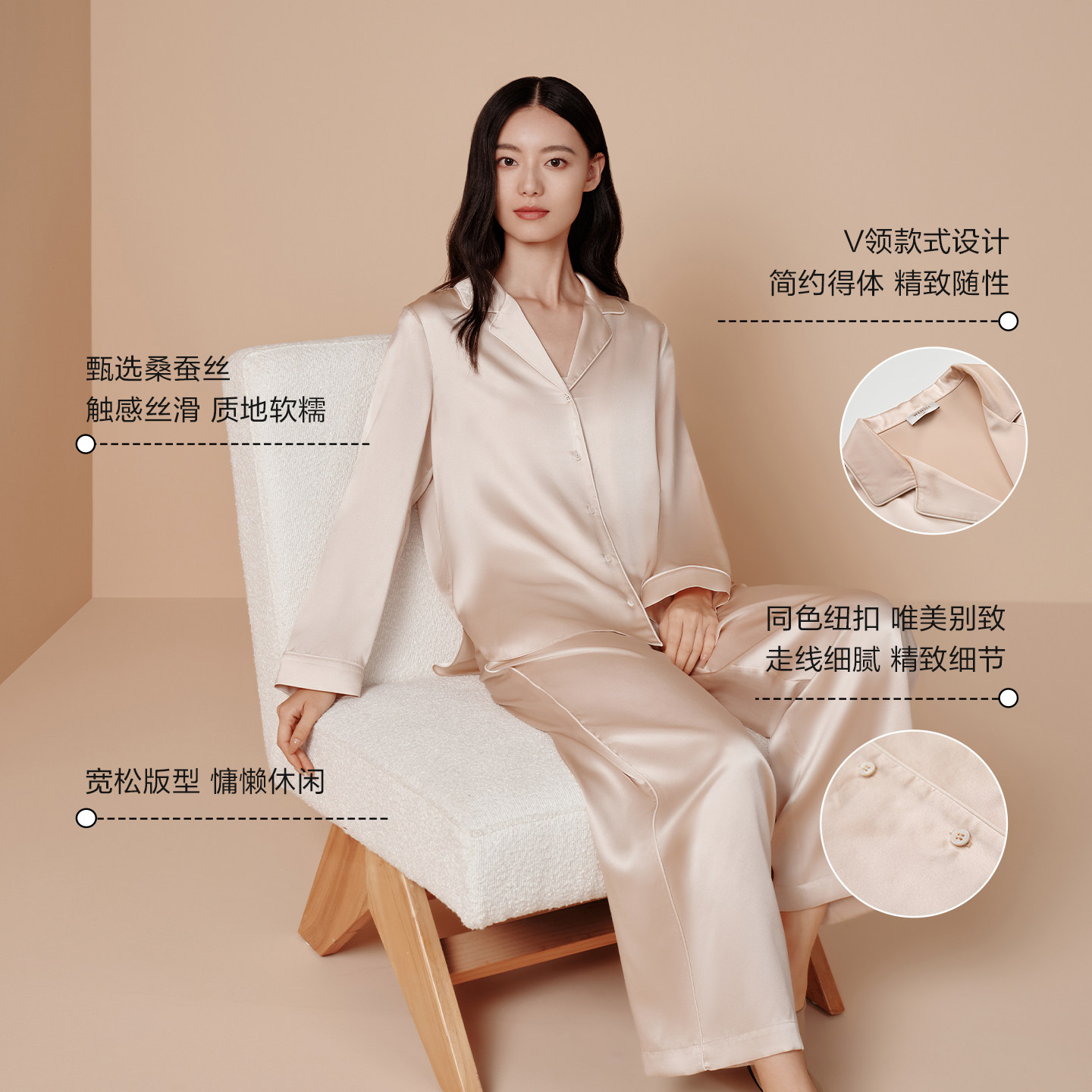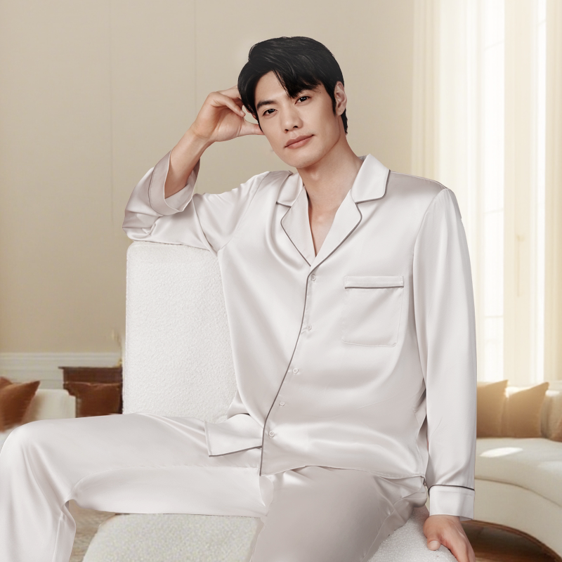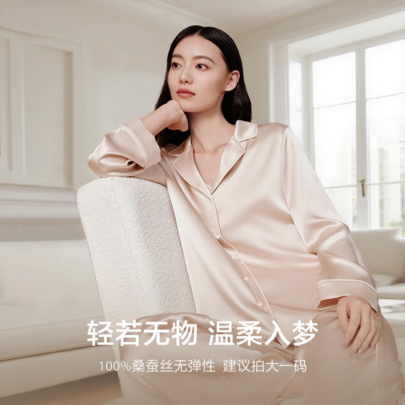 万事利新品真丝睡衣桑蚕丝纯色睡衣可机洗家居上下套男女款简逸