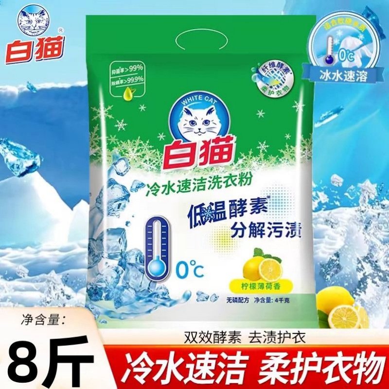 白猫洗衣粉4kg冷水速洁速溶大袋无磷酵素家庭装柠檬污渍抑菌家用