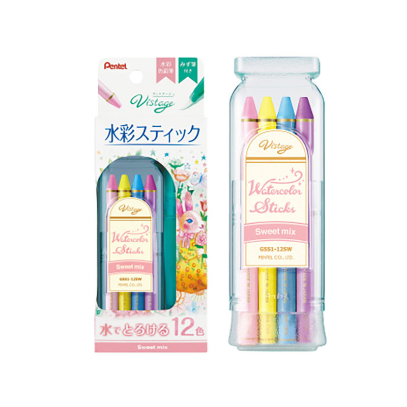 日本Pentel/派通 Vistage鸡尾酒水彩棒水性蜡笔12色组合(附自来水笔) 复古风甜美大人的水彩