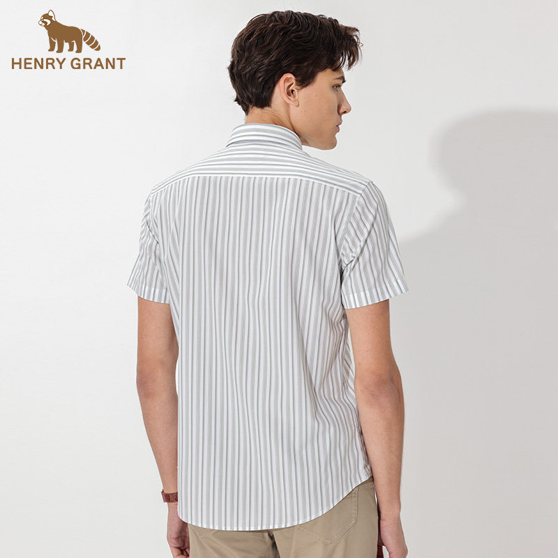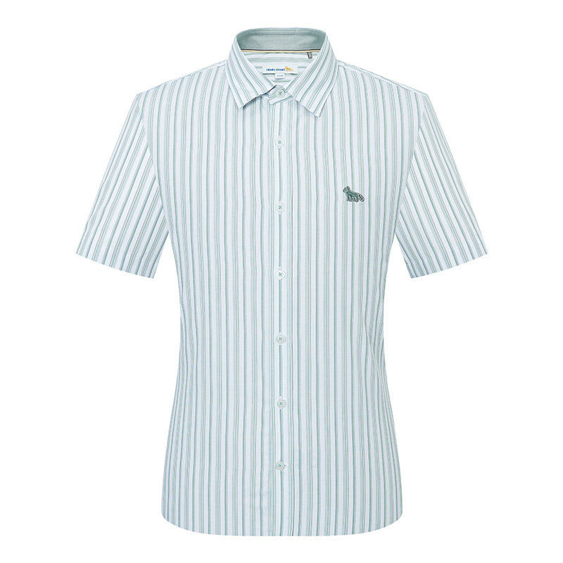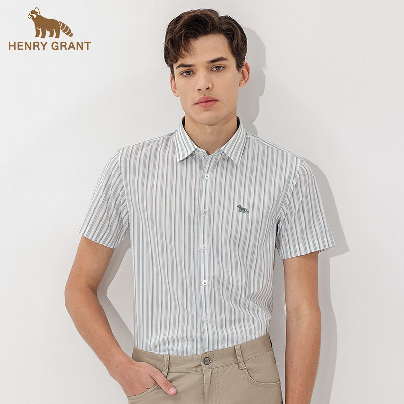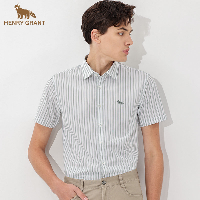 亨利格兰男装小熊猫夏季新款英伦休闲条纹撞色时尚高级感短袖衬衫