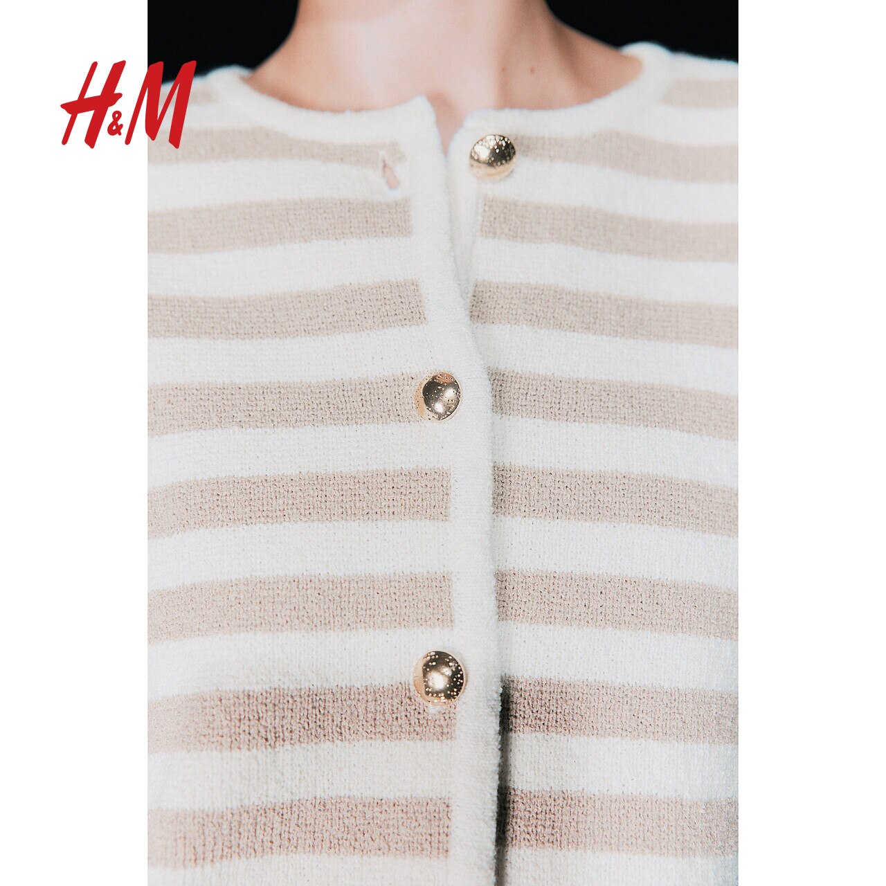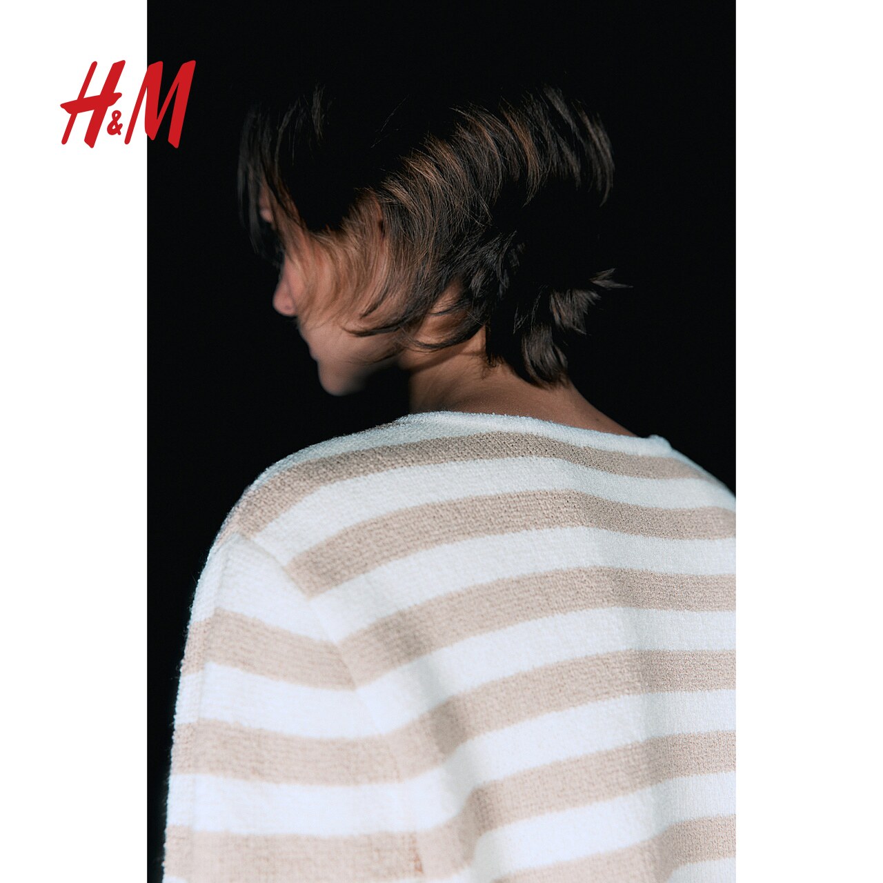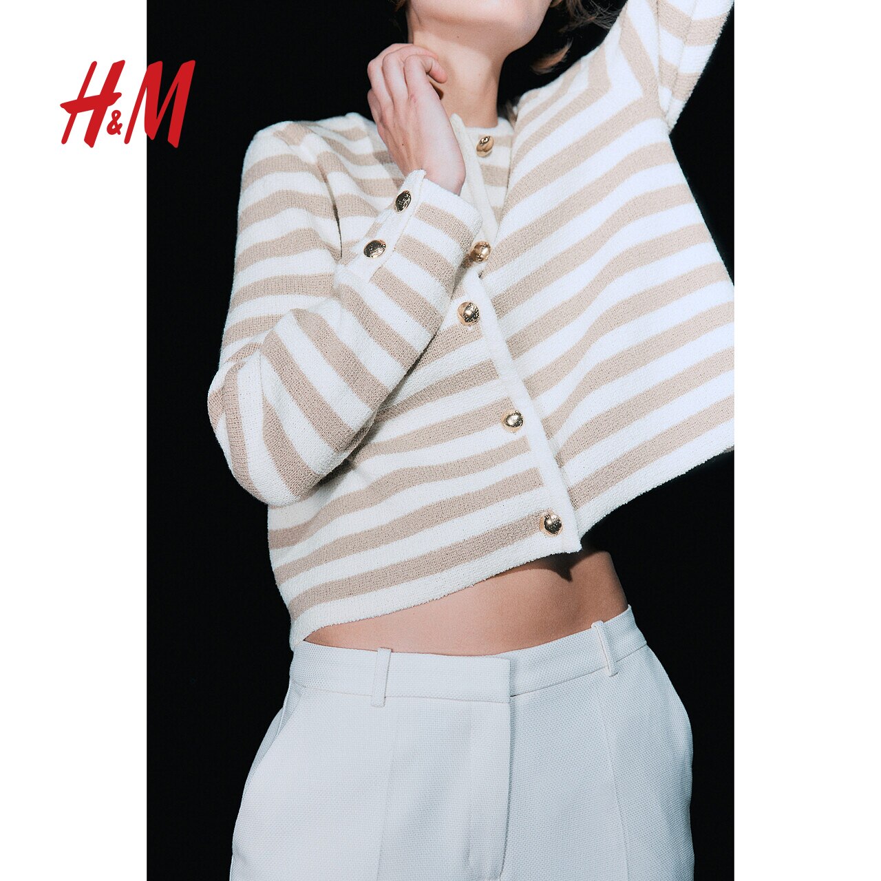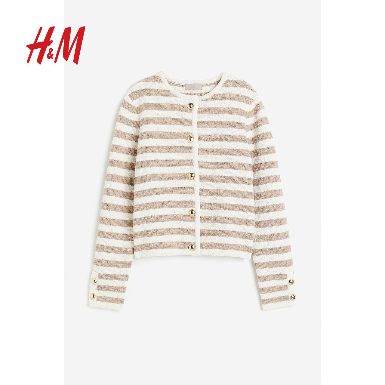 HM女装毛针织衫春季时尚休闲条纹千金小香风针织开衫外套1191819