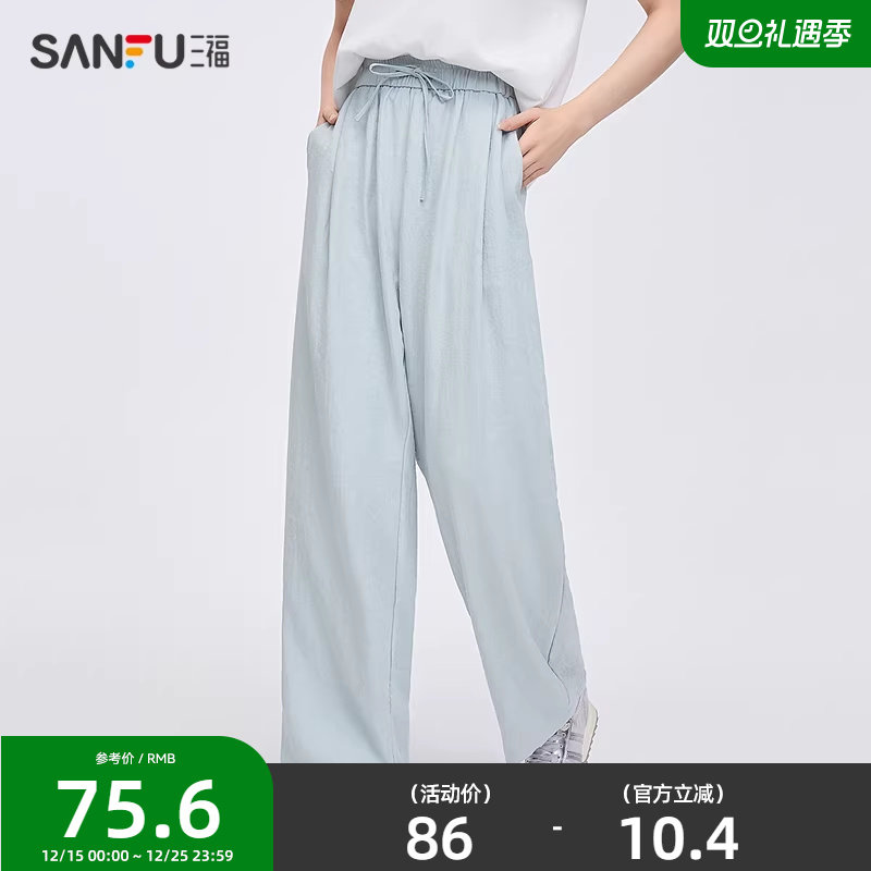 三福休闲裤2025夏季简约抽绳松紧腰宽松阔腿裤长裤女装838483