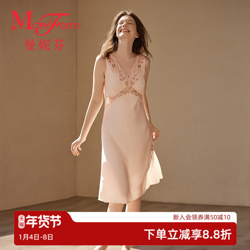 曼妮芬法式睡衣女士V领无袖蕾丝睡裙女舒适性感家居长款裙装