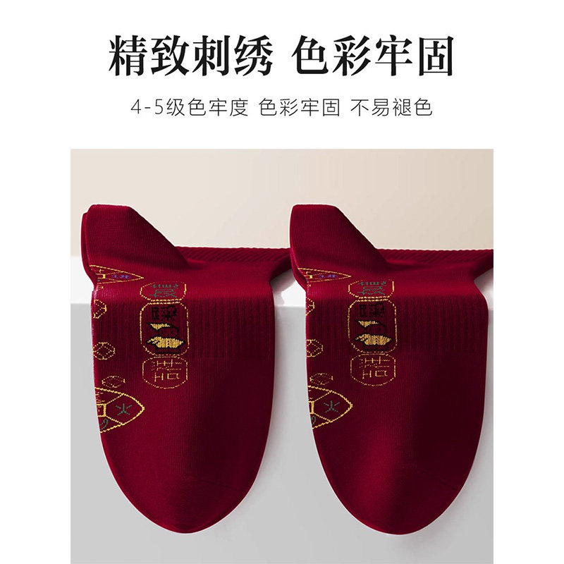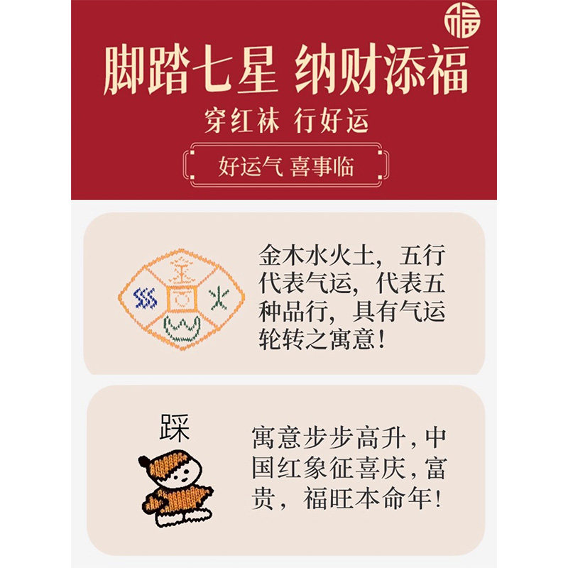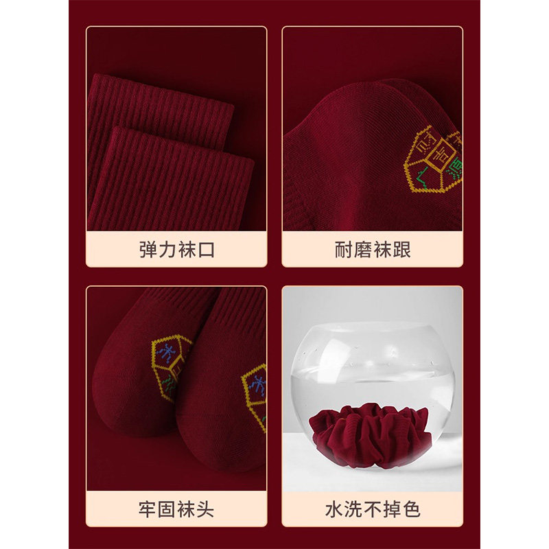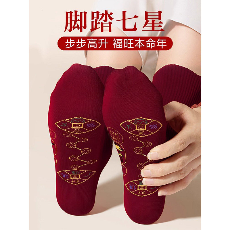 2026马年本命年红色袜子纯棉中筒袜脚踏七星连珠踩鸿运男女情侣袜