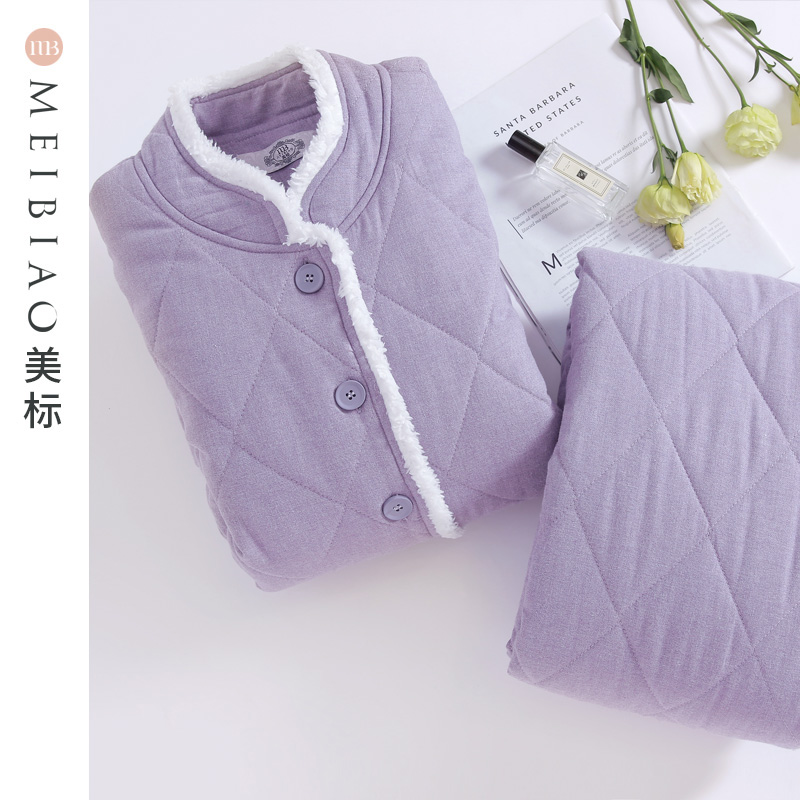 美标三层加厚保暖夹棉纯棉睡衣套装女秋冬中国风全棉可外穿家居服