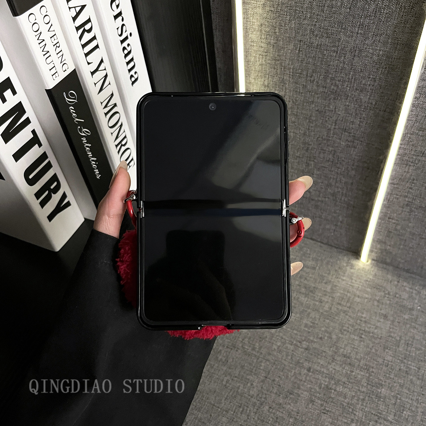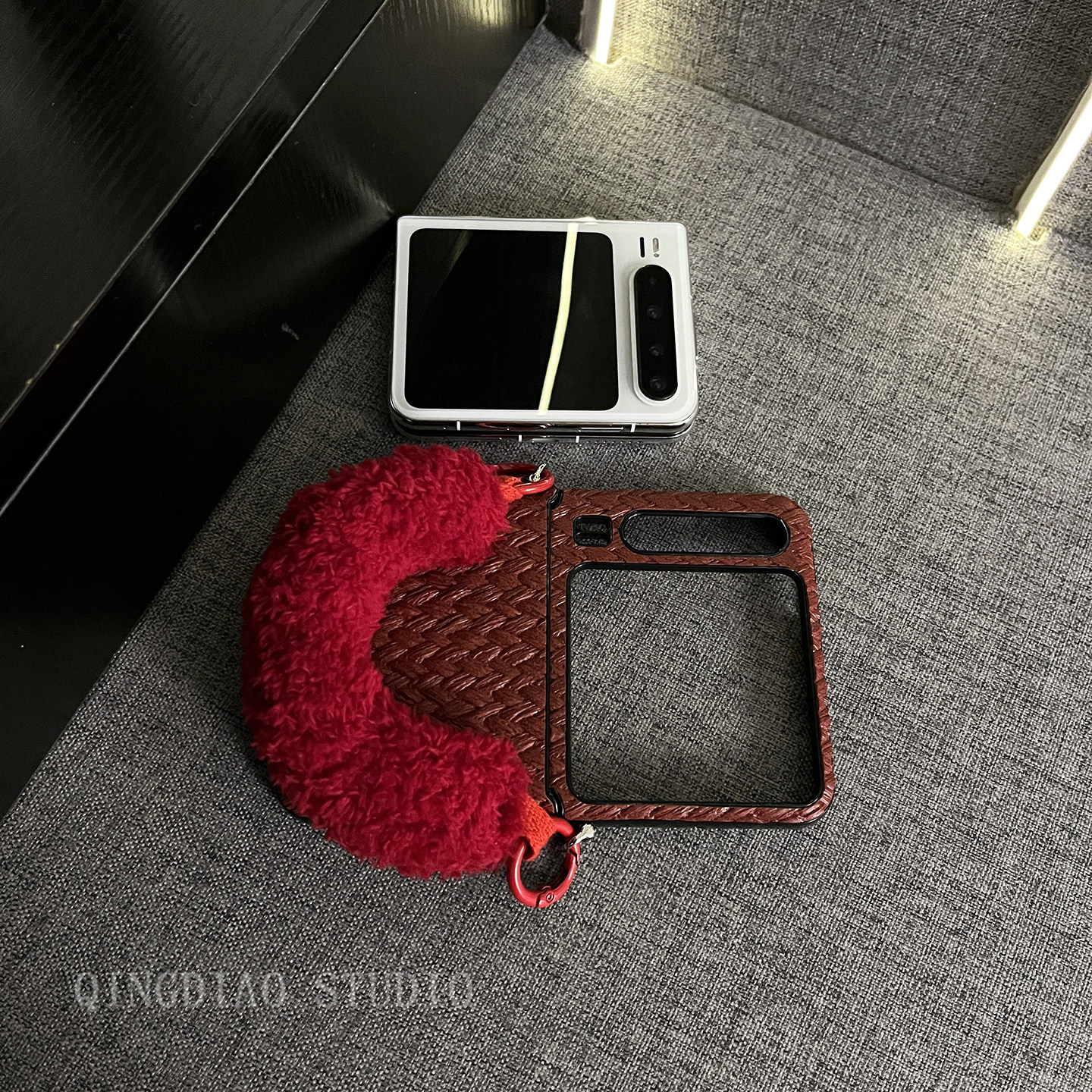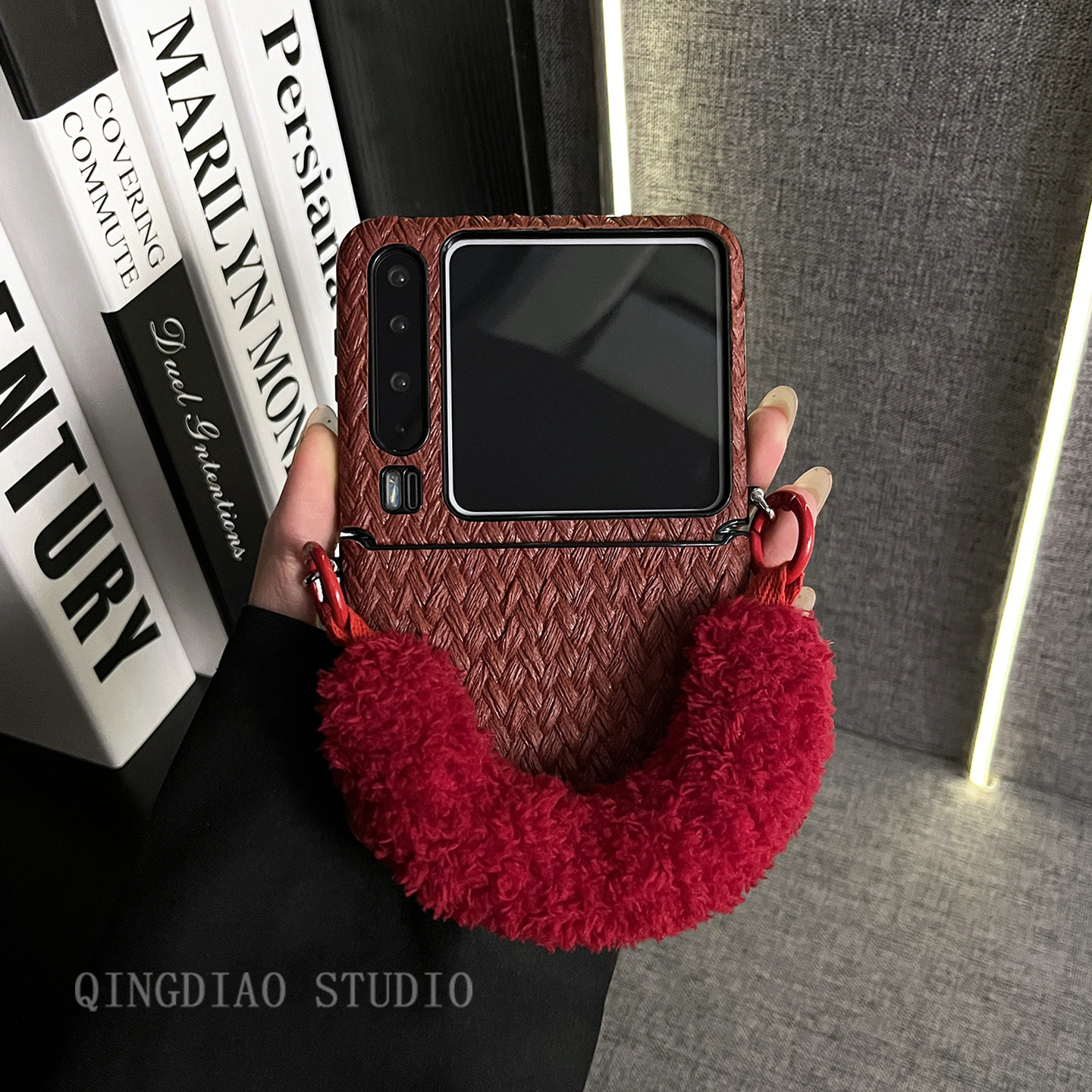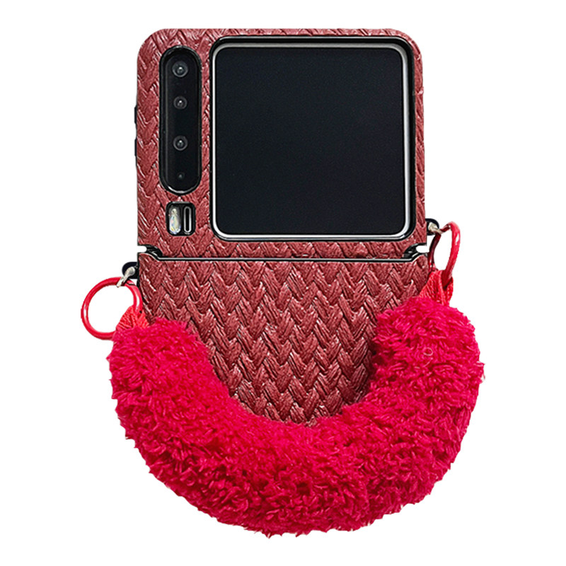 轻调 韩风红色草席纹毛茸手提腕带适用于华为Pura X手机壳全包新款purax典藏版折叠屏p50宝盒翻盖防摔保护套