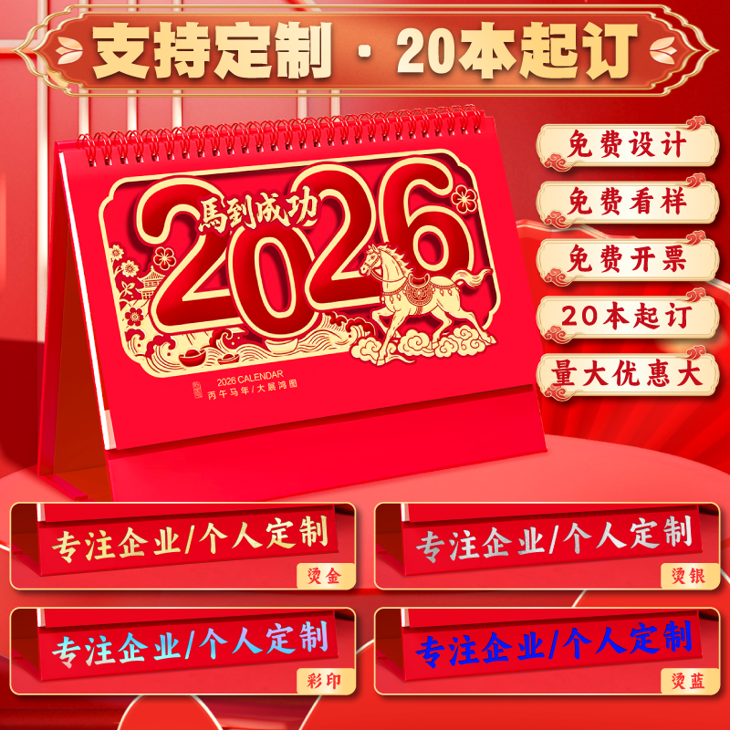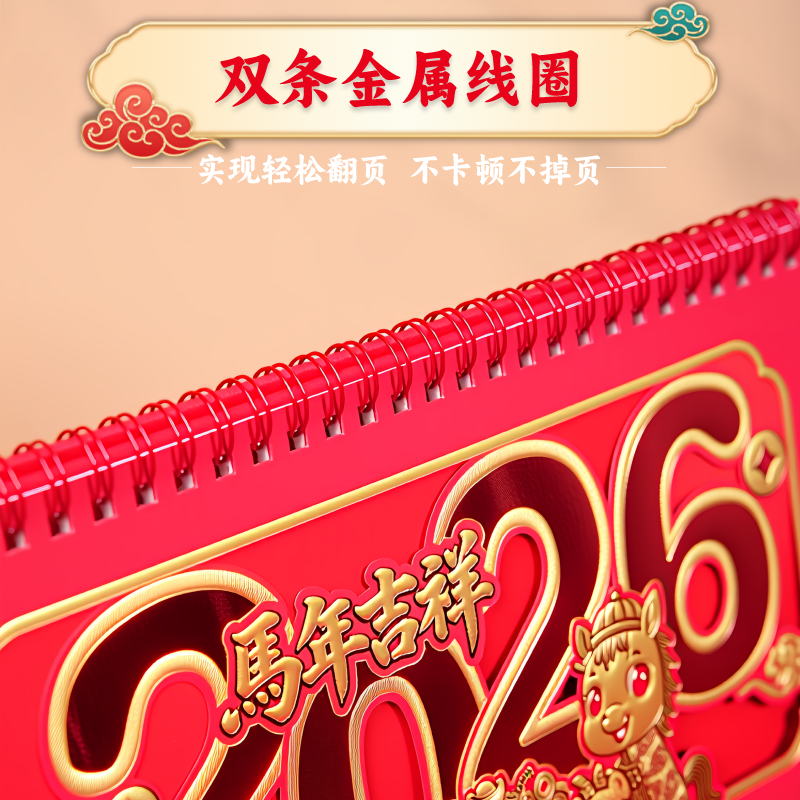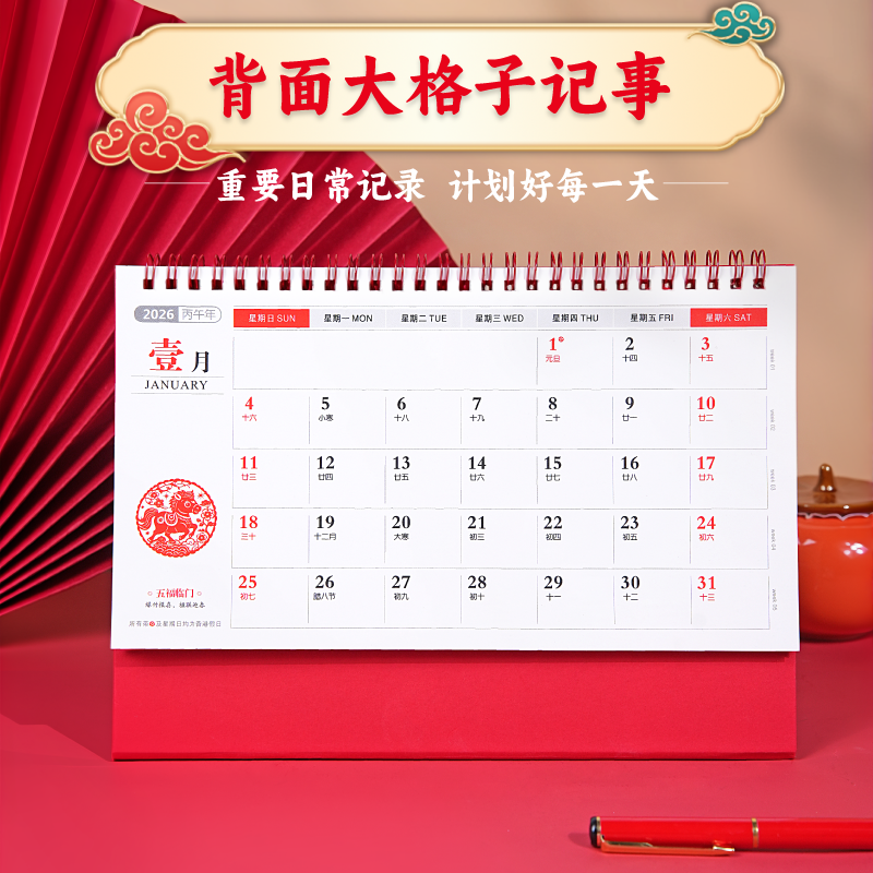 台历2026年新款烫金镂空日历大号横款办公桌摆件企业礼品中国风马年创意新年喜庆月历广告记事红色大格子彩印