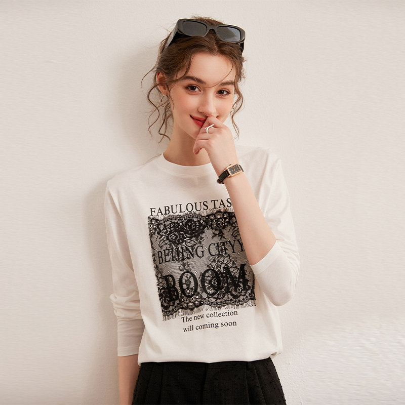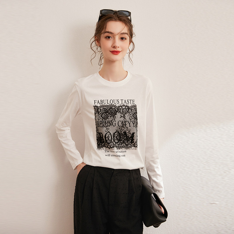 白鹿语时尚字母印花拼接花边T恤秋新款休闲圆领百搭长袖T恤女