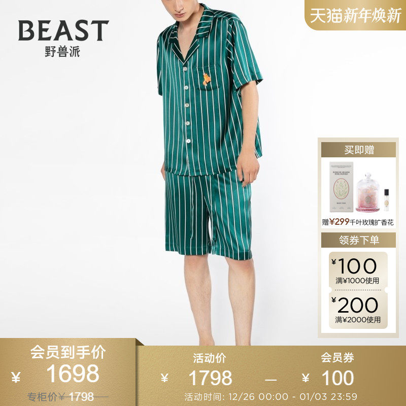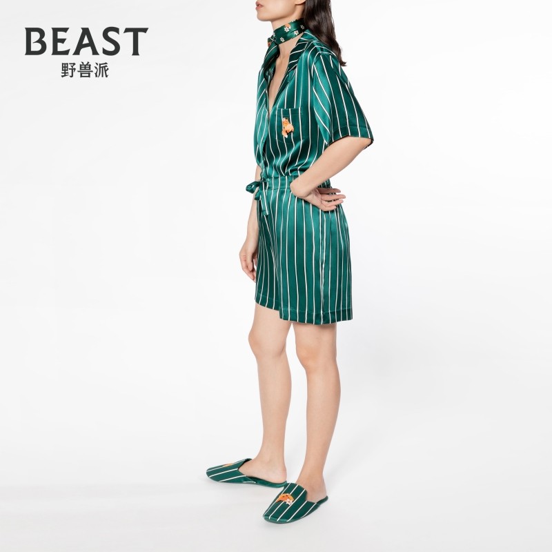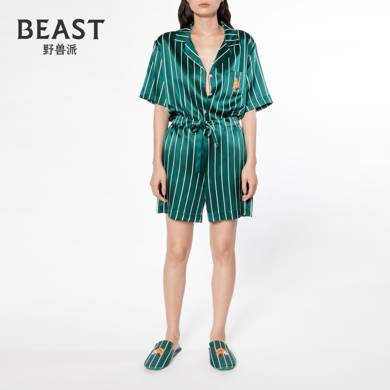 BEAST野兽派小狐狸绿条纹印花22姆米真丝睡衣短袖女礼物