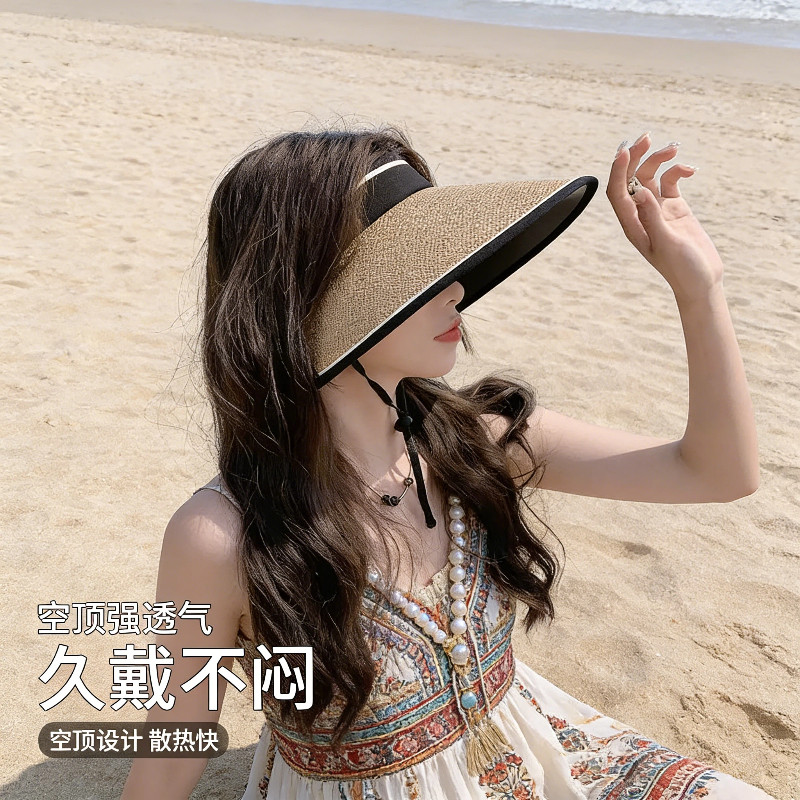大帽檐夏季防紫外线空顶防晒帽女海边帽子遮阳草帽遮脸可折叠草编