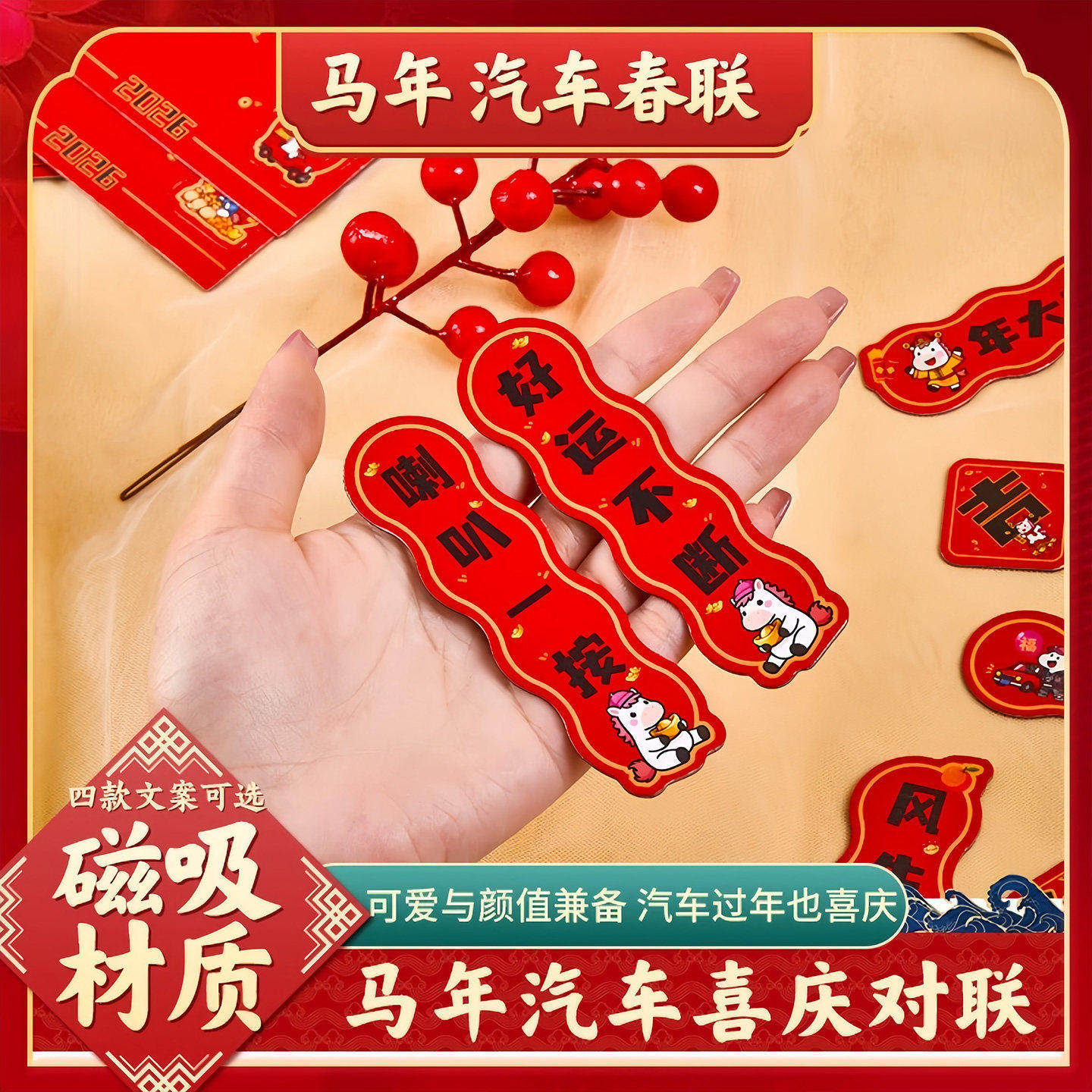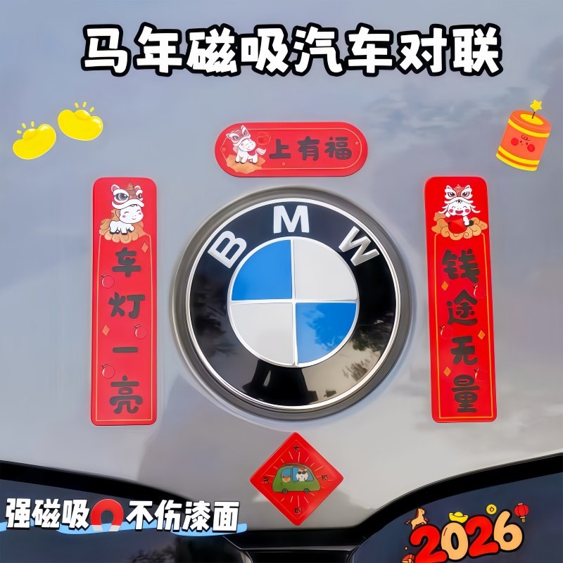 2026马年新款可爱汽车磁吸对联防水防晒轿车装饰迷你车贴春节贴纸