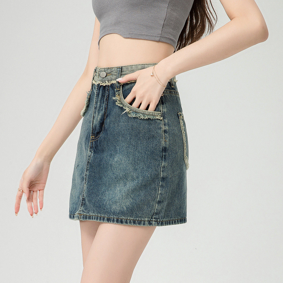 one more2025年夏季新款高腰毛边牛仔短裙女薄款A字半身裙防走光