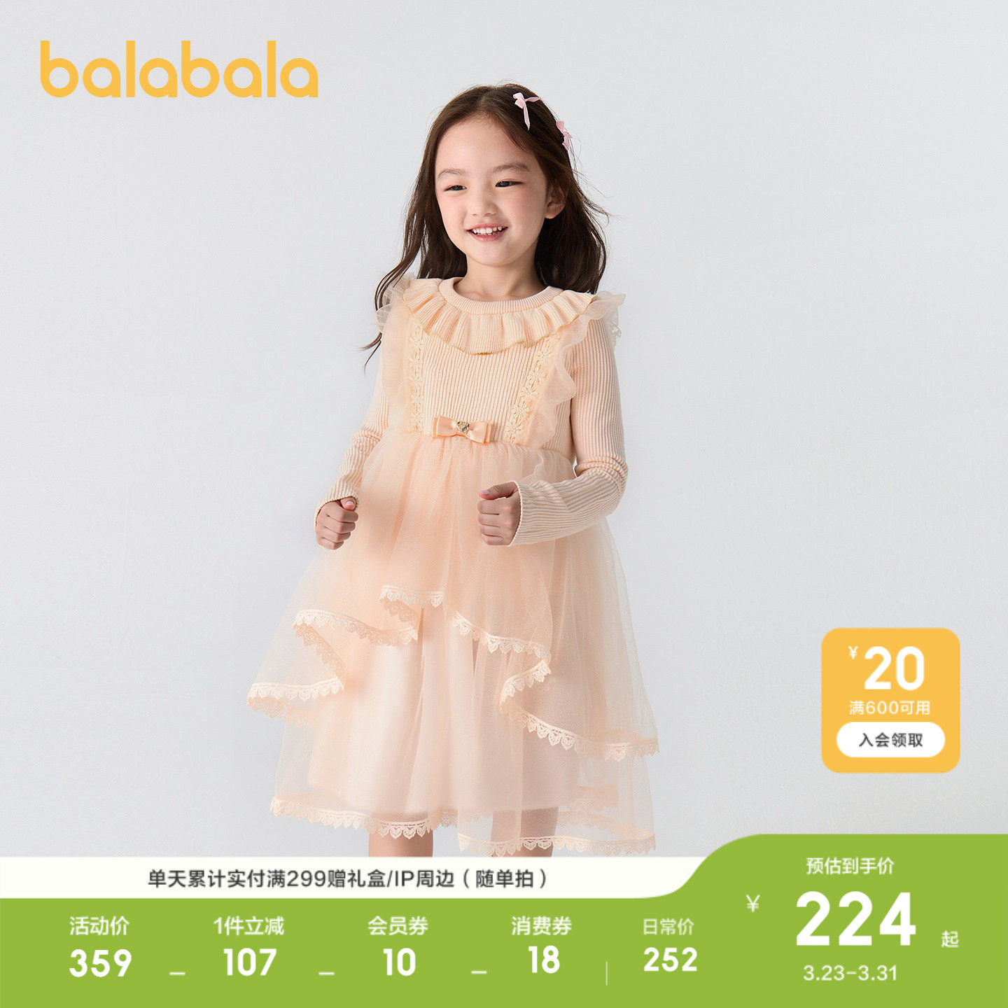 【balaOne】巴拉巴拉童装女童连衣裙2025新款春装网纱裙甜美洋气