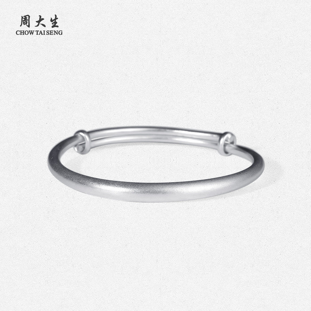 周大生银手镯女S990古法实心素圈推拉银饰生日送女友礼物可刻字