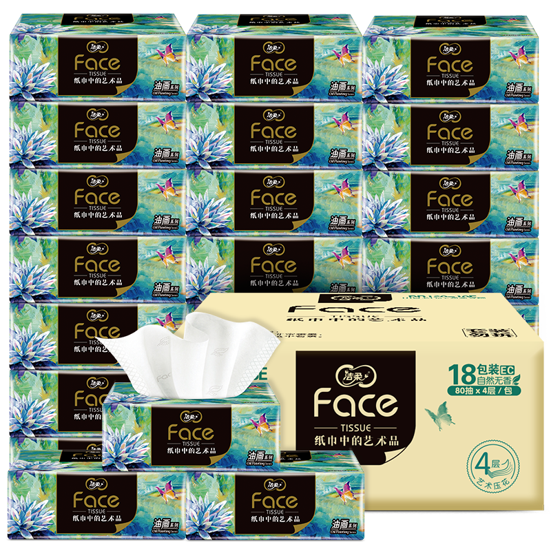 洁柔油画抽纸加大包80抽4层家用擦手纸餐巾纸天然无香抽取式纸