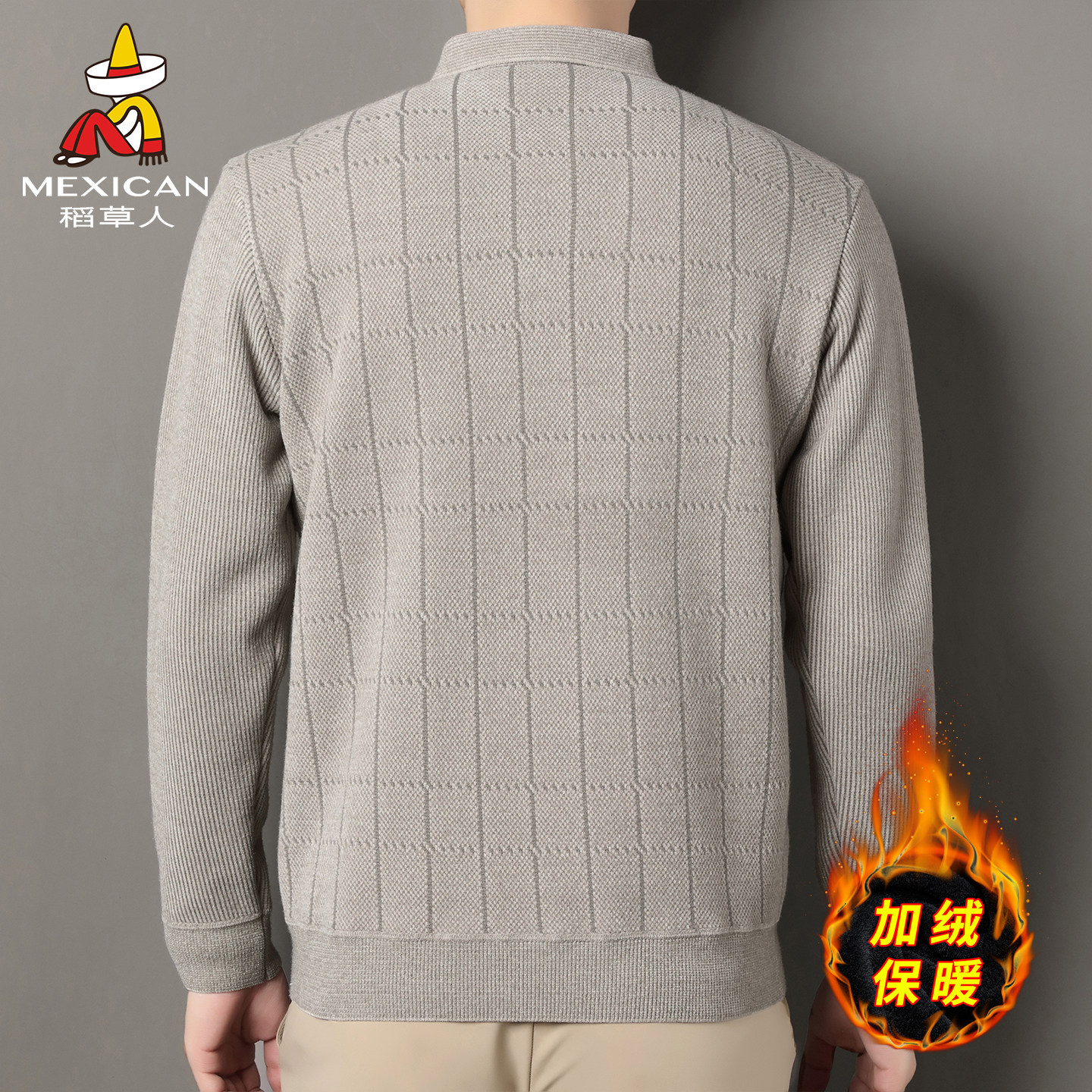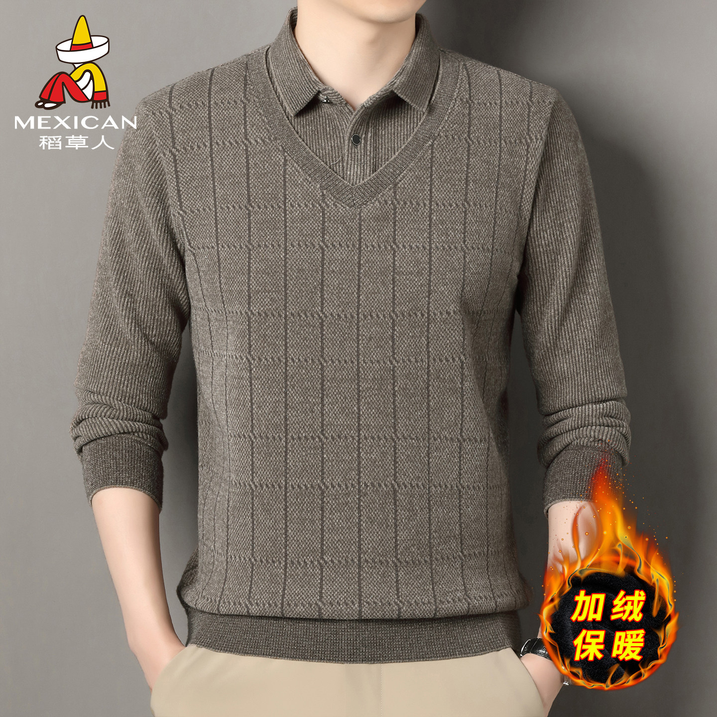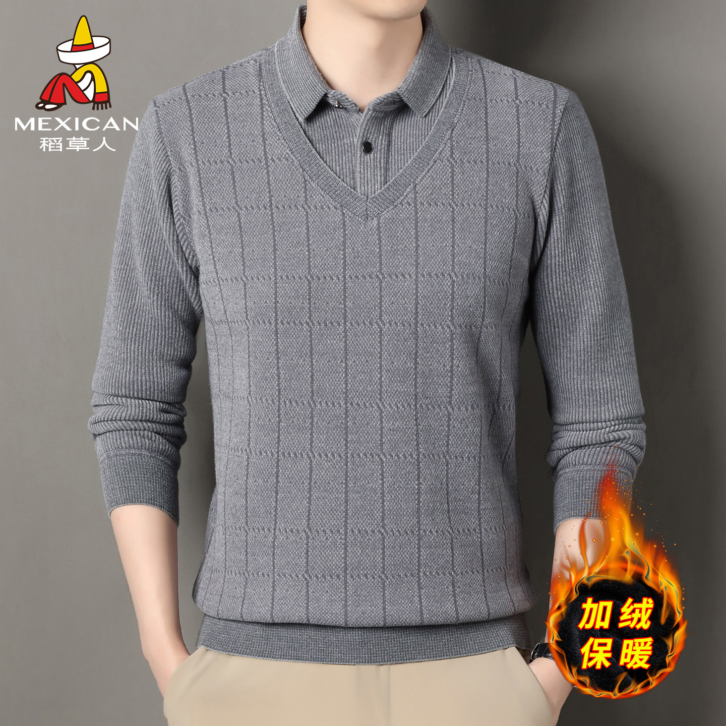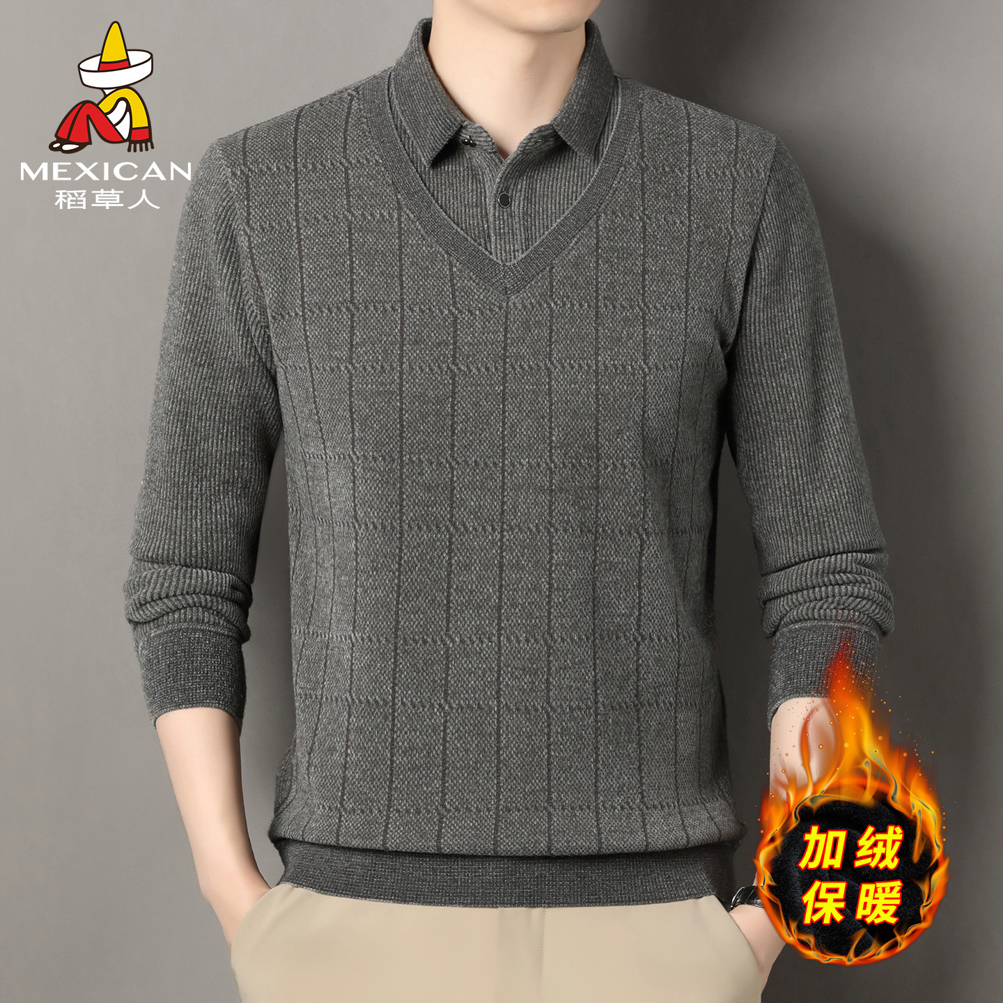 稻草人假两件毛衣男加绒加厚打底衫2025冬季新款休闲保暖羊毛衫J