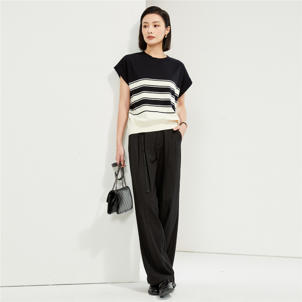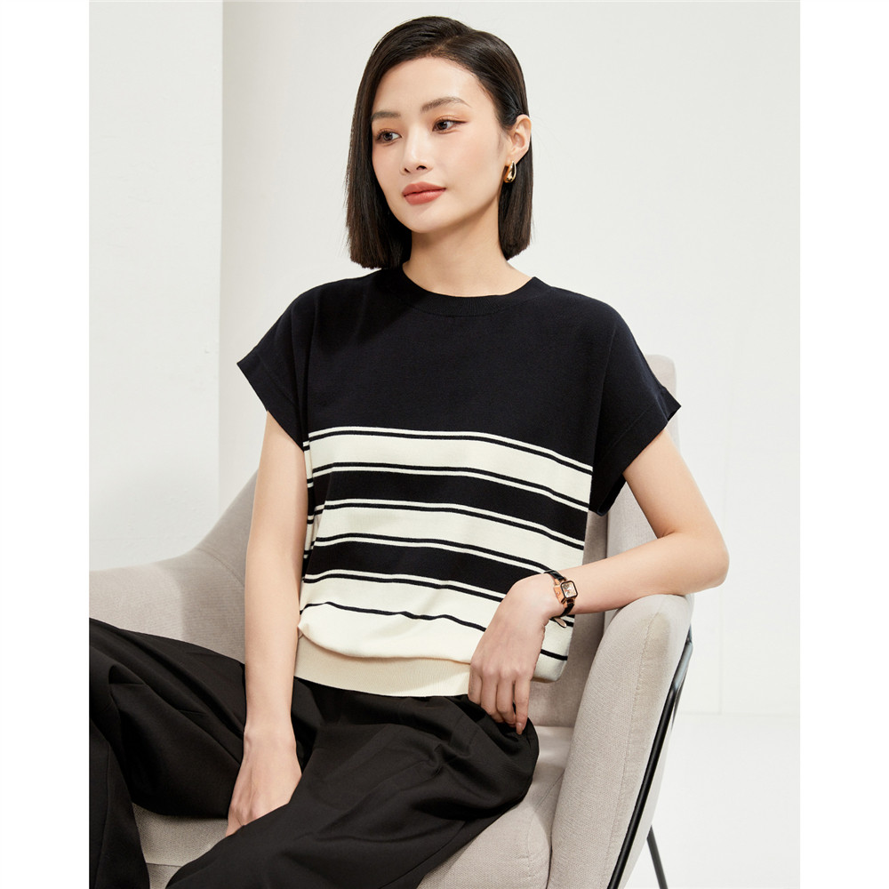 设计师款佐丹奴短袖针织衫女撞色条纹宽松蝙蝠袖圆领上衣18355603