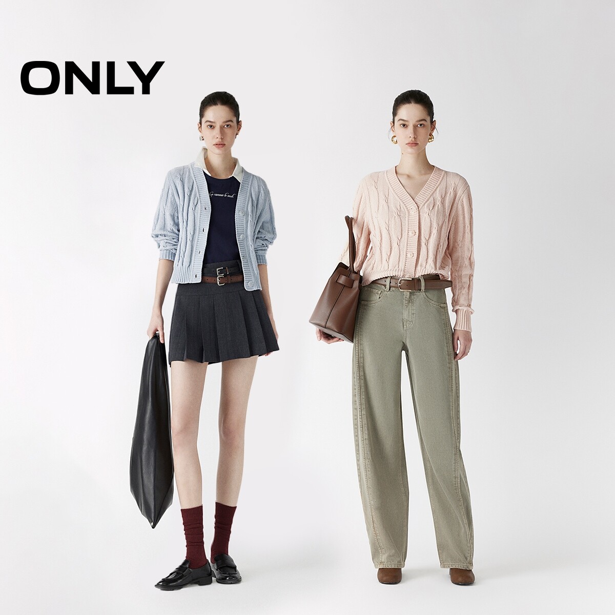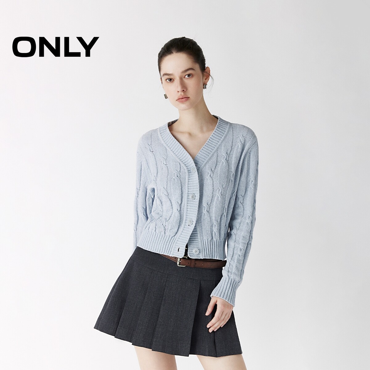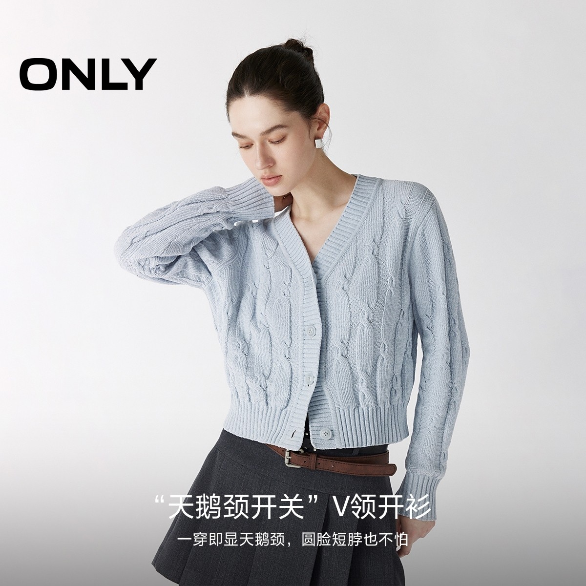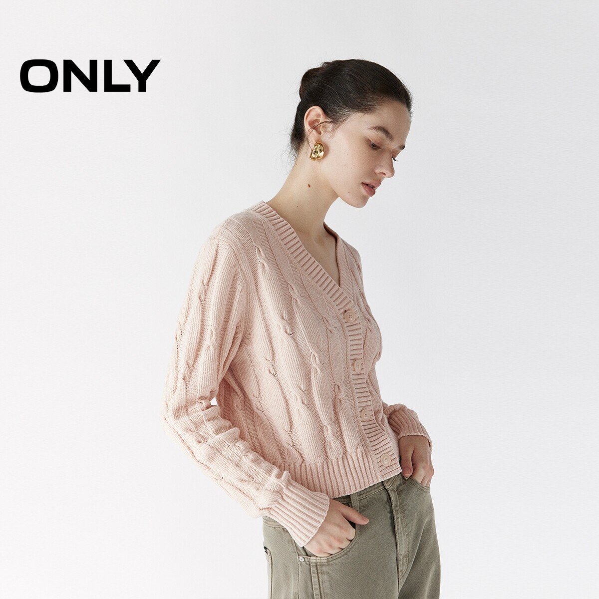 ONLY春季学院风纯色V领雪尼尔麻花开衫针织衫上衣女