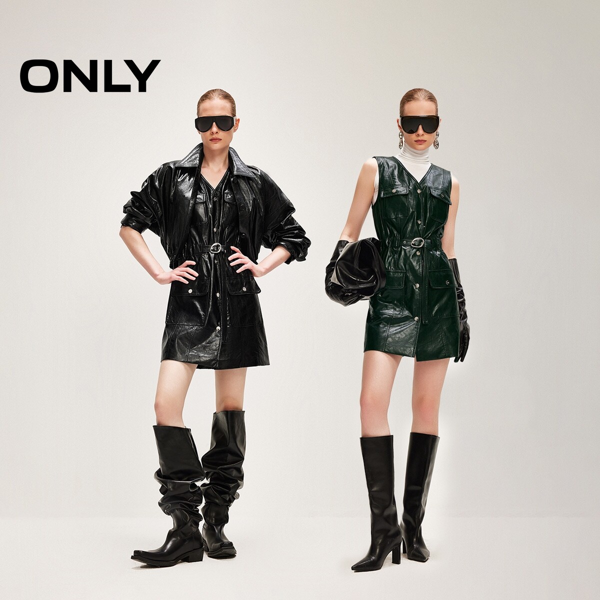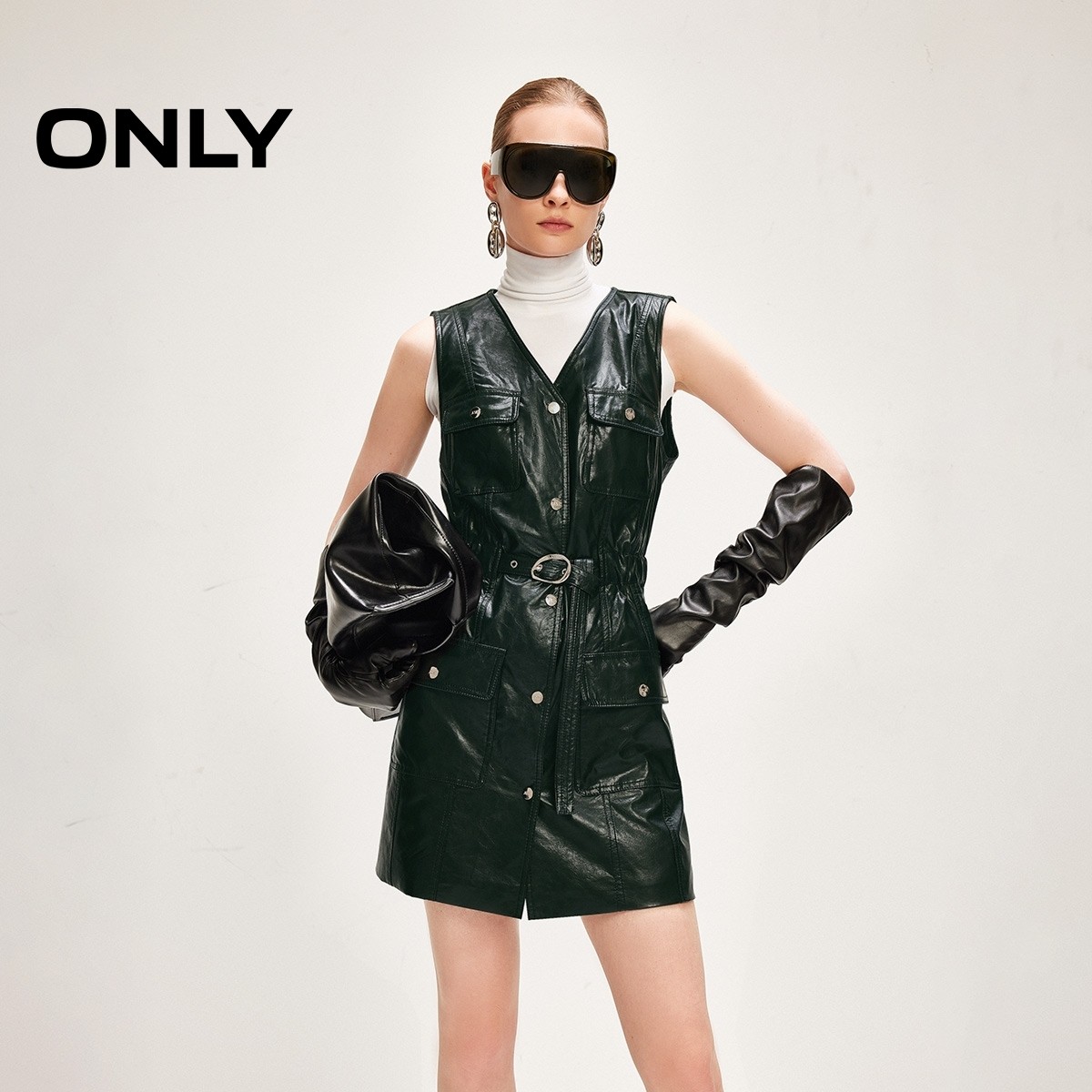 ONLY2026春季新款裙子质感金属按扣摩登V领收腰PU短裙连衣裙女