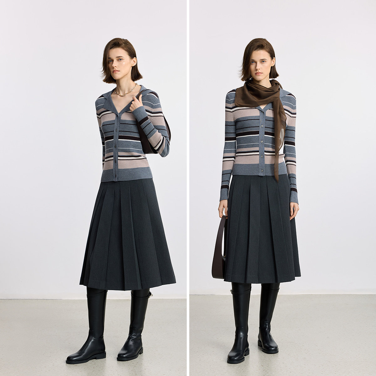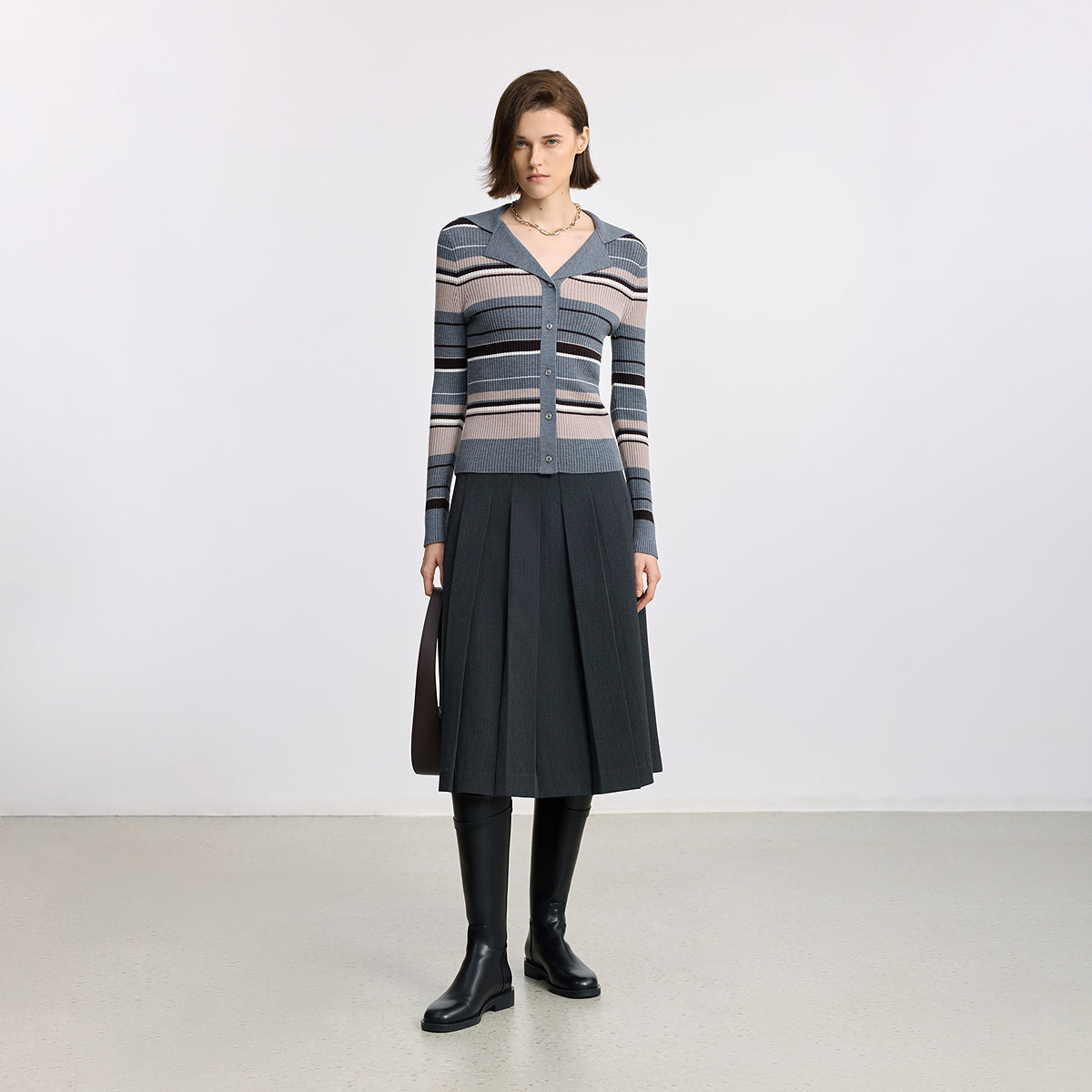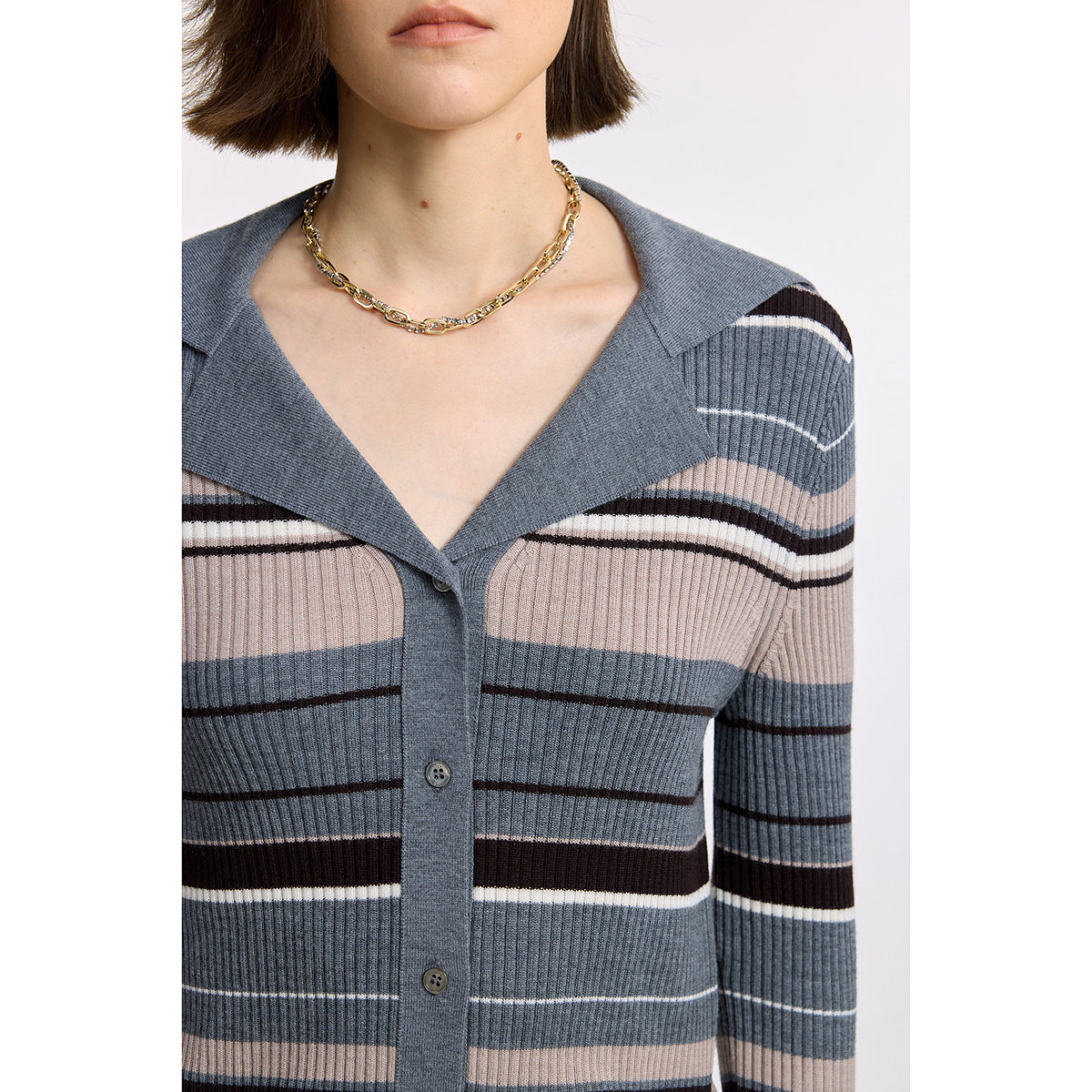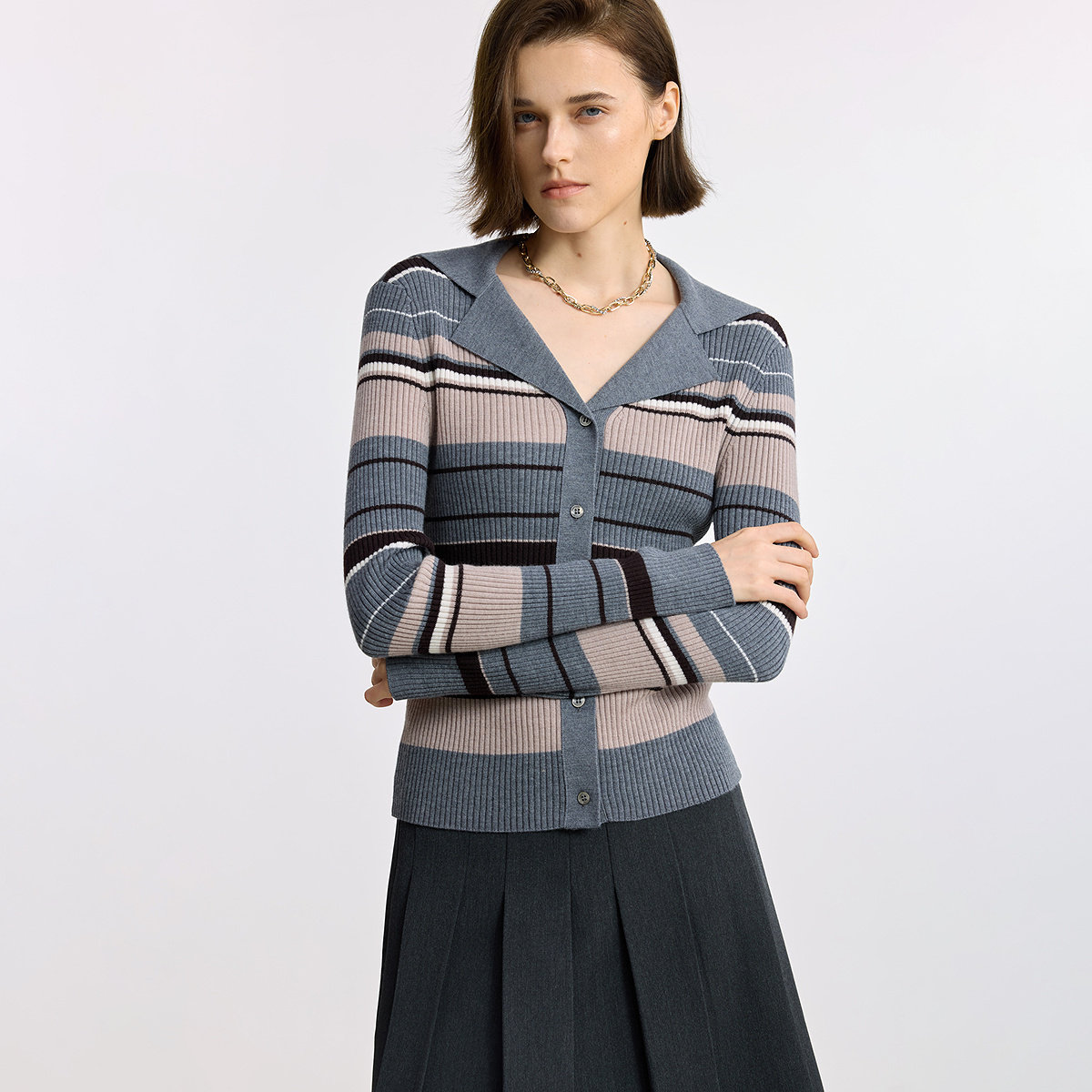 100%美丽诺羊毛LILY2025冬新款女装撞色条纹修身灰色长袖针织开衫